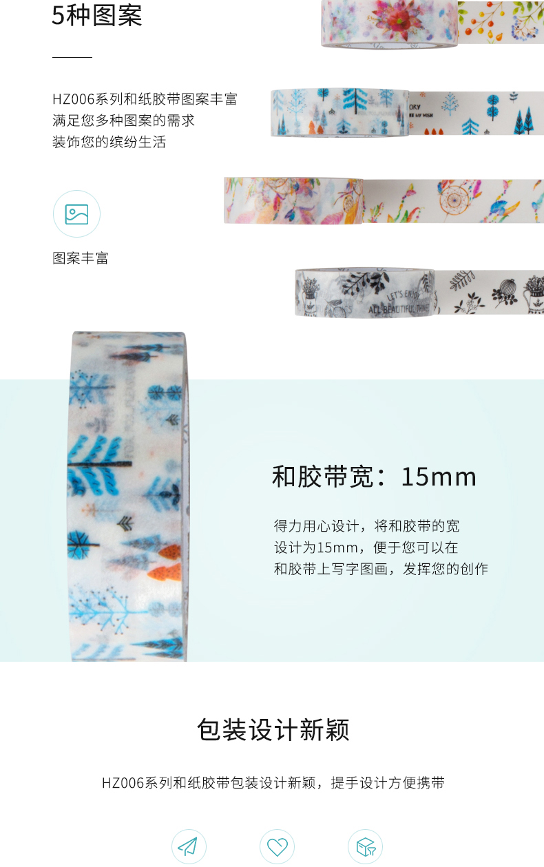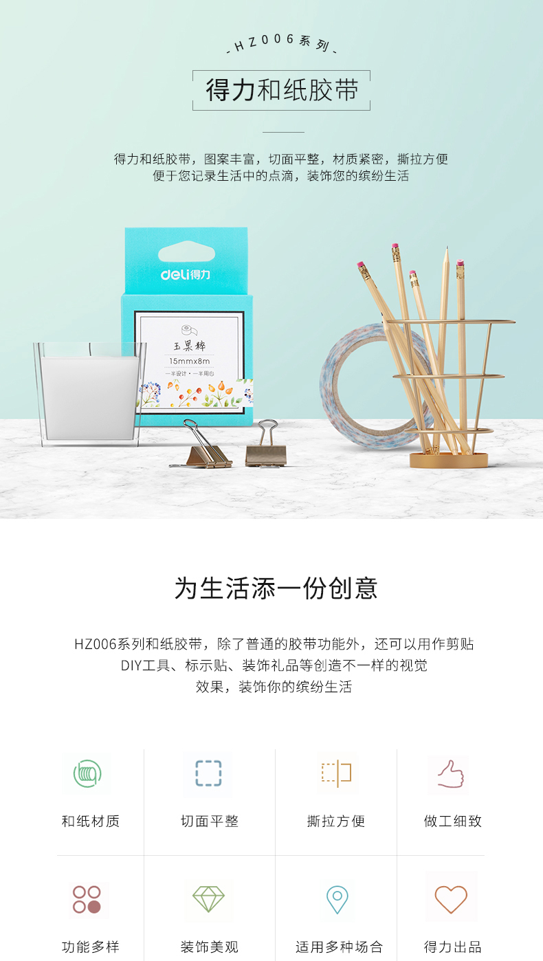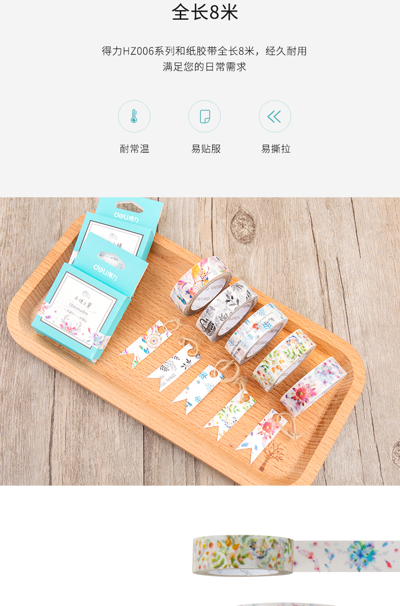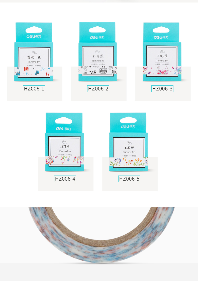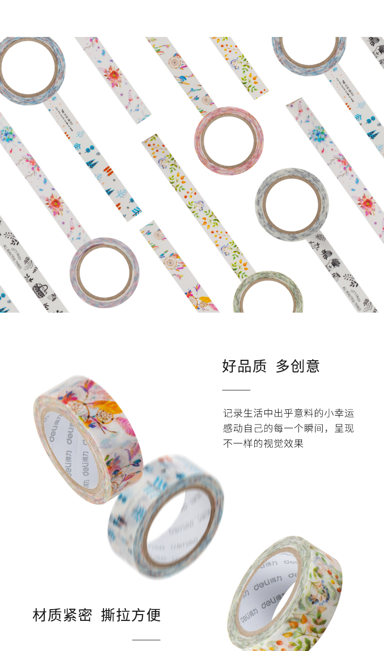 商品名称:得力HZ006,15mm*8m和纸胶带分装整卷diy手撕胶带可爱手账装饰小清新纸胶带 商品编号:11.05.12.0006A 品牌:得力/deli 上架时间:2018-09-12 商品毛重:0克 如果您发现商品信息不准确,欢迎纠错;如果您发现有比51文具价格更低的,欢迎举报
