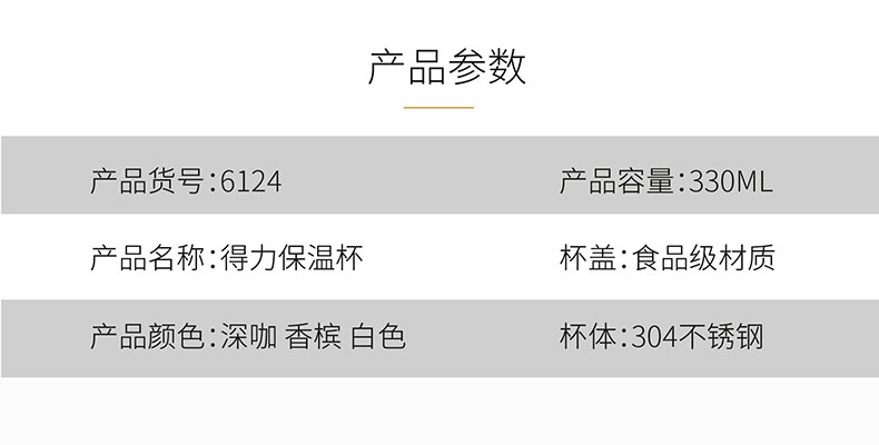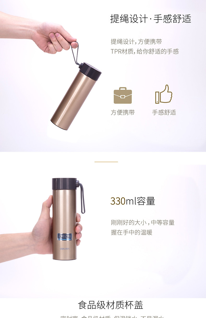 商品名称:得力6124,330ml真空不锈钢保温杯,得力水杯 330ml香槟色,白 商品编号:12.08.83.6124 品牌:文具/LZN 上架时间:2018-09-12 商品毛重:0克 如果您发现商品信息不准确,欢迎纠错;如果您发现有比51文具价格更低的,欢迎举报
