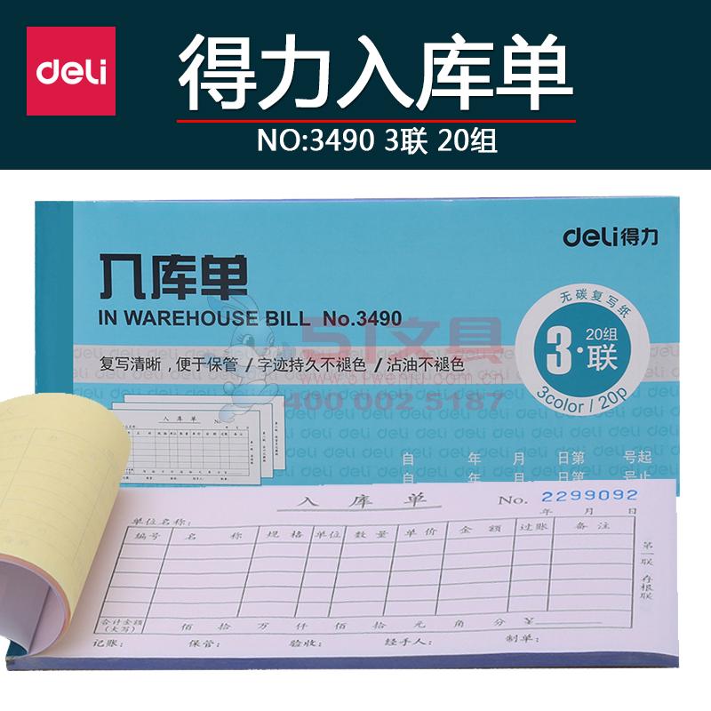 商品名称:得力3490,48K三联入库单(1/10/400)单据无碳复写入库单入库统计单据三联复写清晰-176*83mm 商品编号:12.05.49.3490 品牌:文具/LZN 上架时间:2018-10-18 商品毛重:0克 如果您发现商品信息不准确,欢迎纠错;如果您发现有比51文具价格更低的,欢迎举报