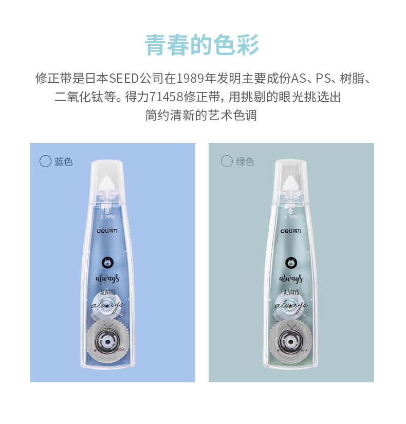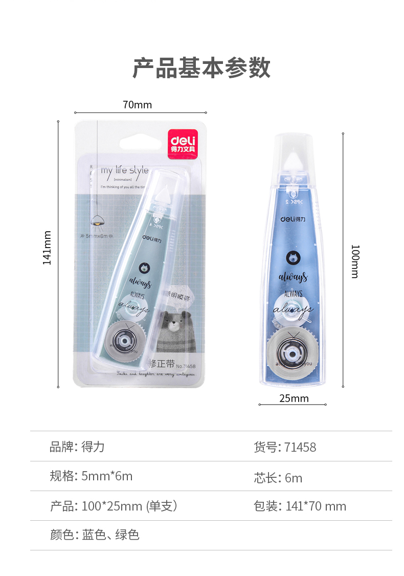 商品名称:得力71458,5mm*6m修正带(1/12/432)小学生儿童修改带改正带涂改带简约学生用品 商品编号:11.02.01.71458 品牌:得力/deli 上架时间:2018-11-08 商品毛重:0克 如果您发现商品信息不准确,欢迎纠错;如果您发现有比51文具价格更低的,欢迎举报