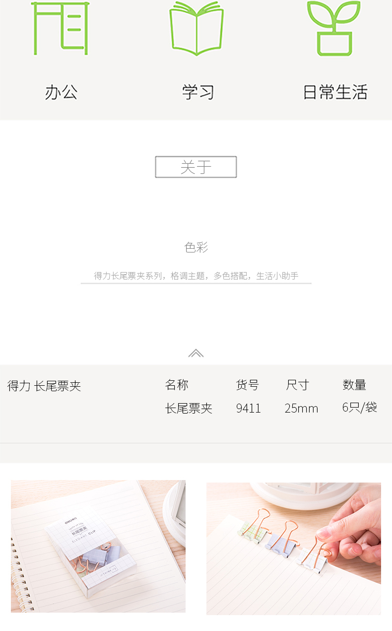 商品名称:得力9411,25mm卡通夹子(1/24/192)学生文具长尾票夹铁金属夹子票据夹燕尾夹 (6只装) 商品编号:11.11.02.9411 品牌:得力/deli 上架时间:2018-11-08 商品毛重:0克 如果您发现商品信息不准确,欢迎纠错;如果您发现有比51文具价格更低的,欢迎举报