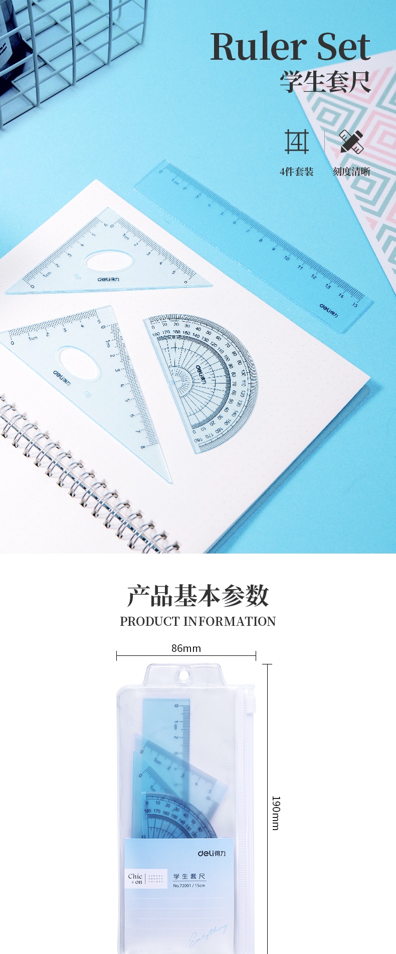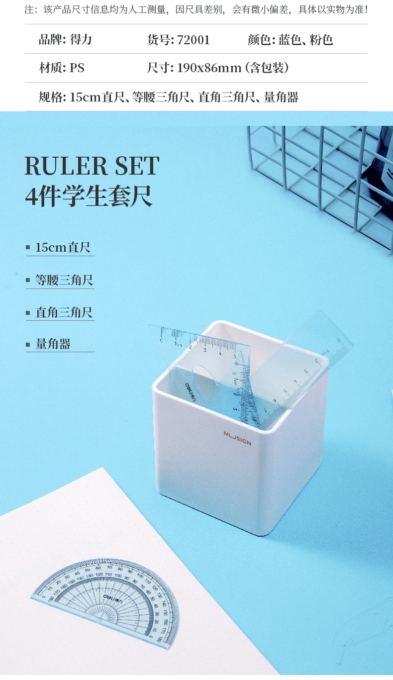 商品名称:得力72001,15cm学生套尺(1/24/432)直尺三角尺量角器四件套 商品编号:11.11.04.72001 品牌:得力/deli 上架时间:2018-11-09 商品毛重:0克 如果您发现商品信息不准确,欢迎纠错;如果您发现有比51文具价格更低的,欢迎举报