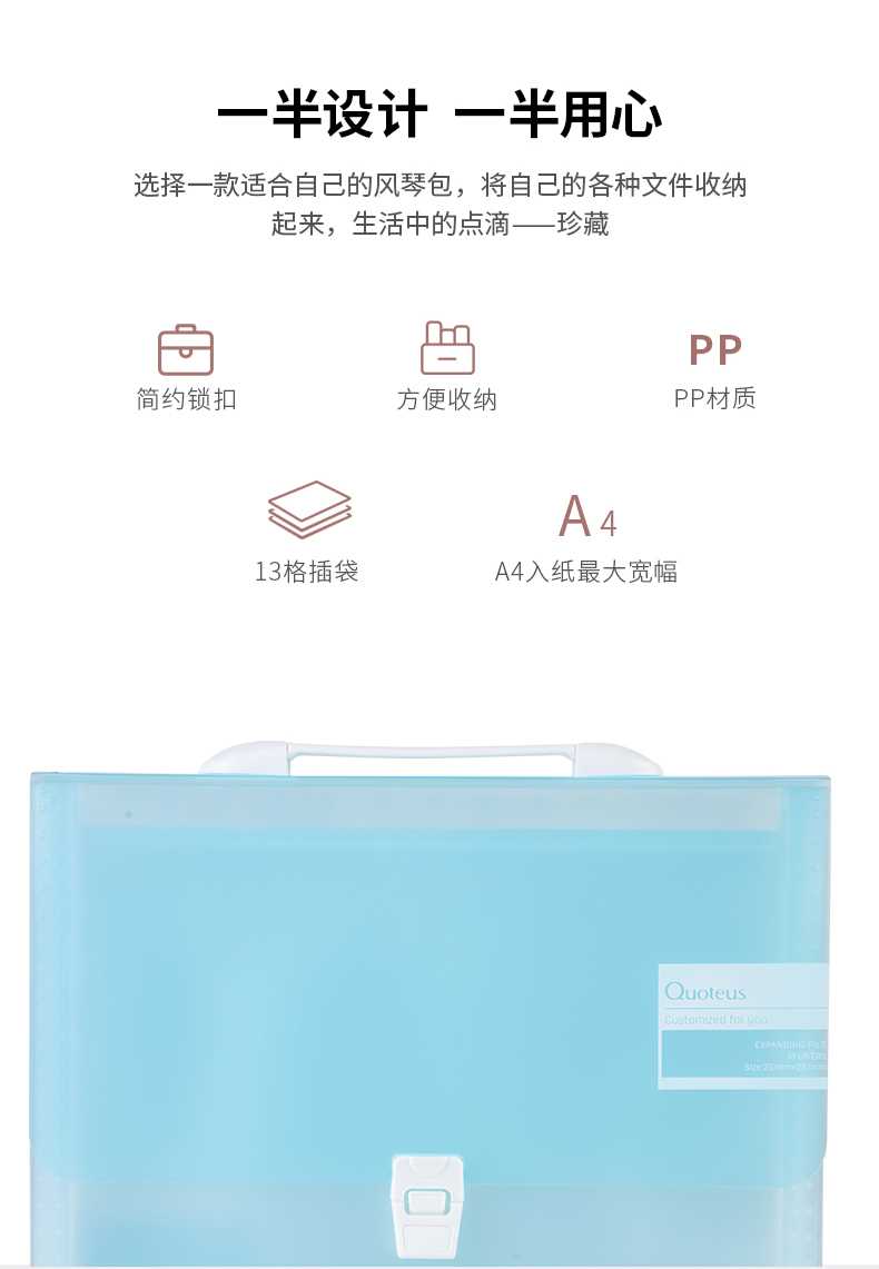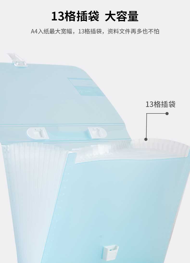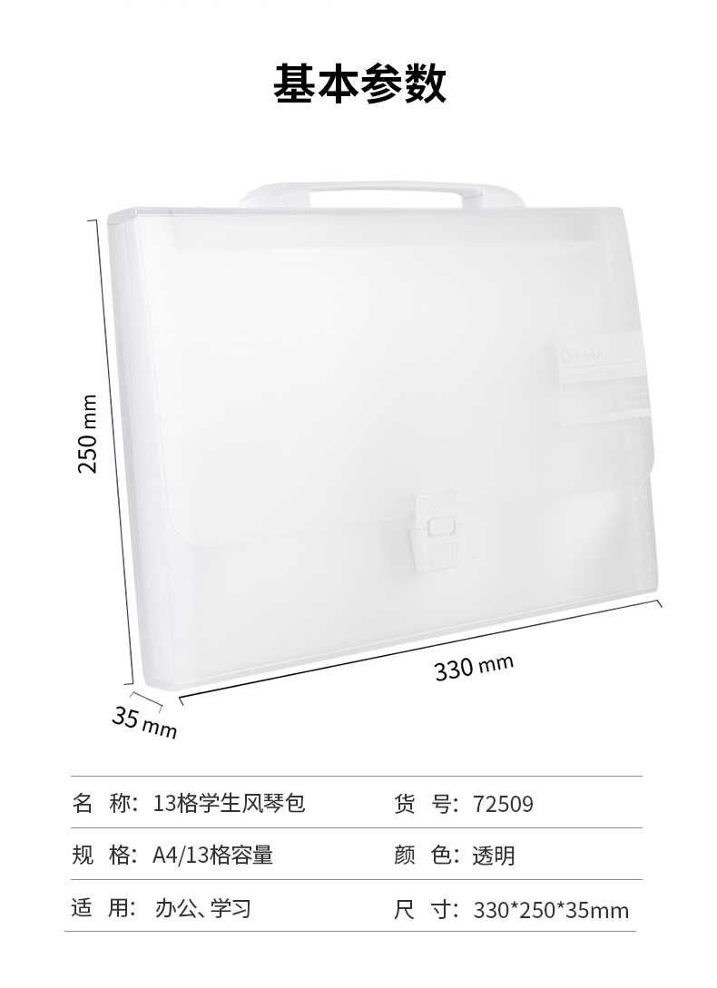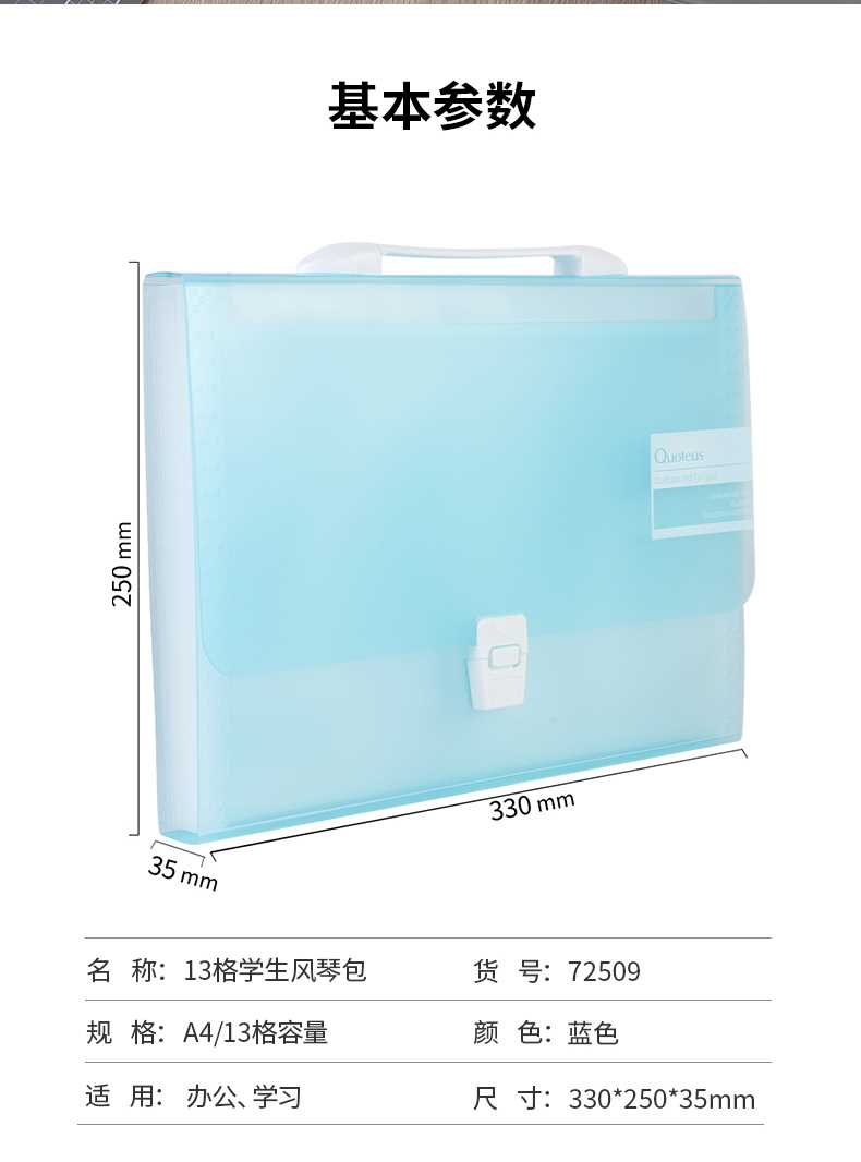商品名称:得力72509,13格 A4风琴事务包(1/12/48)资料册文件袋学生大容量办公收纳盒清新 商品编号:11.02.05.72509 品牌:得力/deli 上架时间:2018-11-09 商品毛重:0克 如果您发现商品信息不准确,欢迎纠错;如果您发现有比51文具价格更低的,欢迎举报