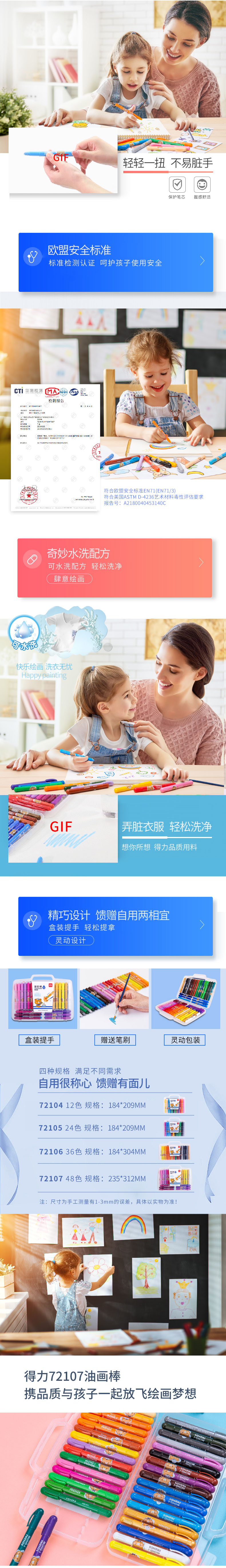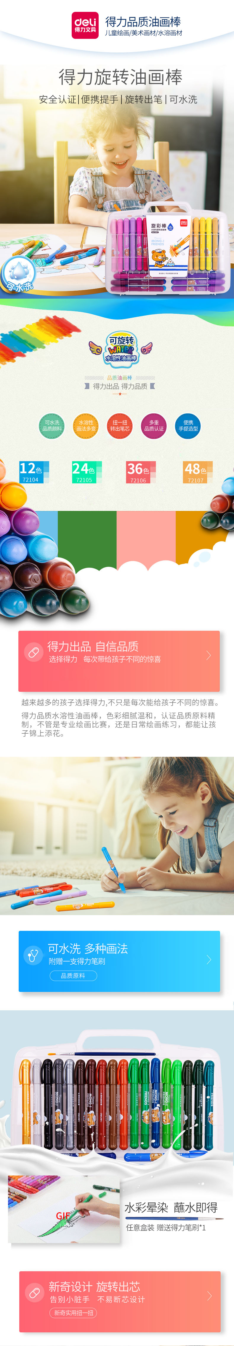 商品名称:得力72105,24色水溶性旋转油画棒旋彩棒(1/12/36)儿童彩色蜡笔套装幼儿园安全无毒可水洗宝宝画笔幼儿涂鸦小学生绘画笔涂色彩笔 商品编号:11.05.02.72105 品牌:得力/deli 上架时间:2018-11-19 商品毛重:0克 颜色数:24色 包装含量:1/12/36 价格单位:盒 如果您发现商品信息不准确,欢迎纠错;如果您发现有比51文具价格更低的,欢迎举报