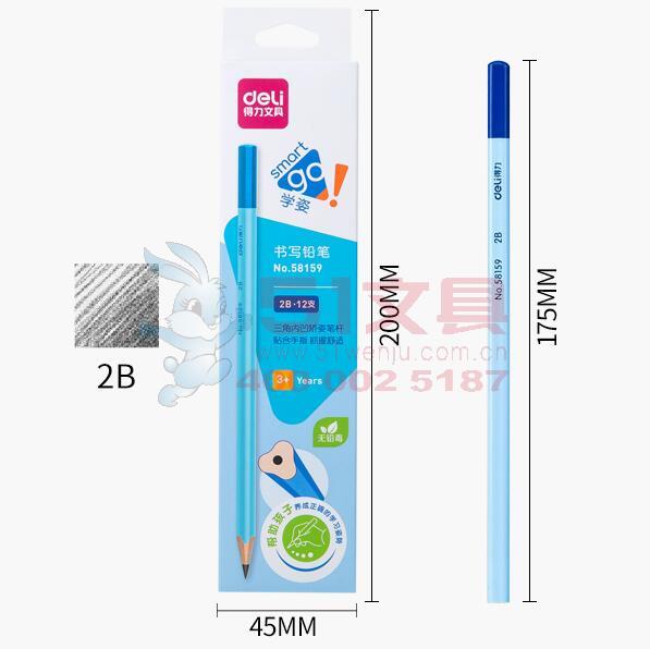 商品名称:得力58159,12支/盒小学生书写2B铅笔(1/12/288)三角杆儿童幼儿园学姿矫正姿势铅笔 商品编号:11.03.03.58159 品牌:得力/deli 上架时间:2018-11-23 商品毛重:0克 类型:2B 是否带橡皮头:不带 包装方式:1/12/288 如果您发现商品信息不准确,欢迎纠错;如果您发现有比51文具价格更低的,欢迎举报