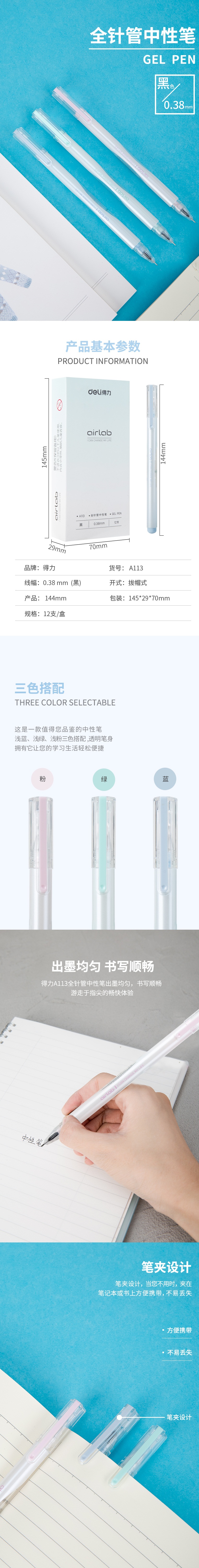 商品名称:得力A113,0.38mm速干中性笔(12/144/1728)淡雅系列学生用笔子弹头商务办公签字碳素笔 商品编号:11.03.01.0113 品牌:得力/deli 上架时间:2018-11-23 商品毛重:0克 价格单位:支 笔头类型:全针管 笔头粗细:0.38mm 包装含量:12/144/1728 如果您发现商品信息不准确,欢迎纠错;如果您发现有比51文具价格更低的,欢迎举报