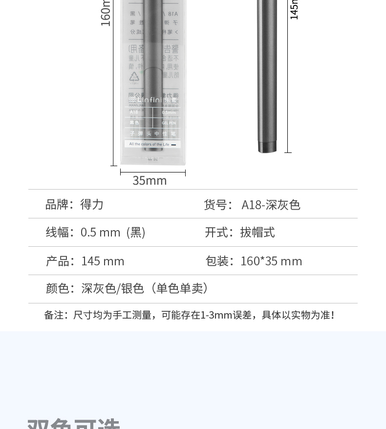 商品名称:得力A18,0.5mm乐素高倍密度中性笔(1/24/288)学生用乐素碳素笔书写顺滑子弹头单支装 商品编号:11.03.01.0018 品牌:得力/deli 上架时间:2018-11-23 商品毛重:0克 价格单位:支 笔头类型:子弹头 笔头粗细:0.5mm 包装含量:1/24/288 如果您发现商品信息不准确,欢迎纠错;如果您发现有比51文具价格更低的,欢迎举报