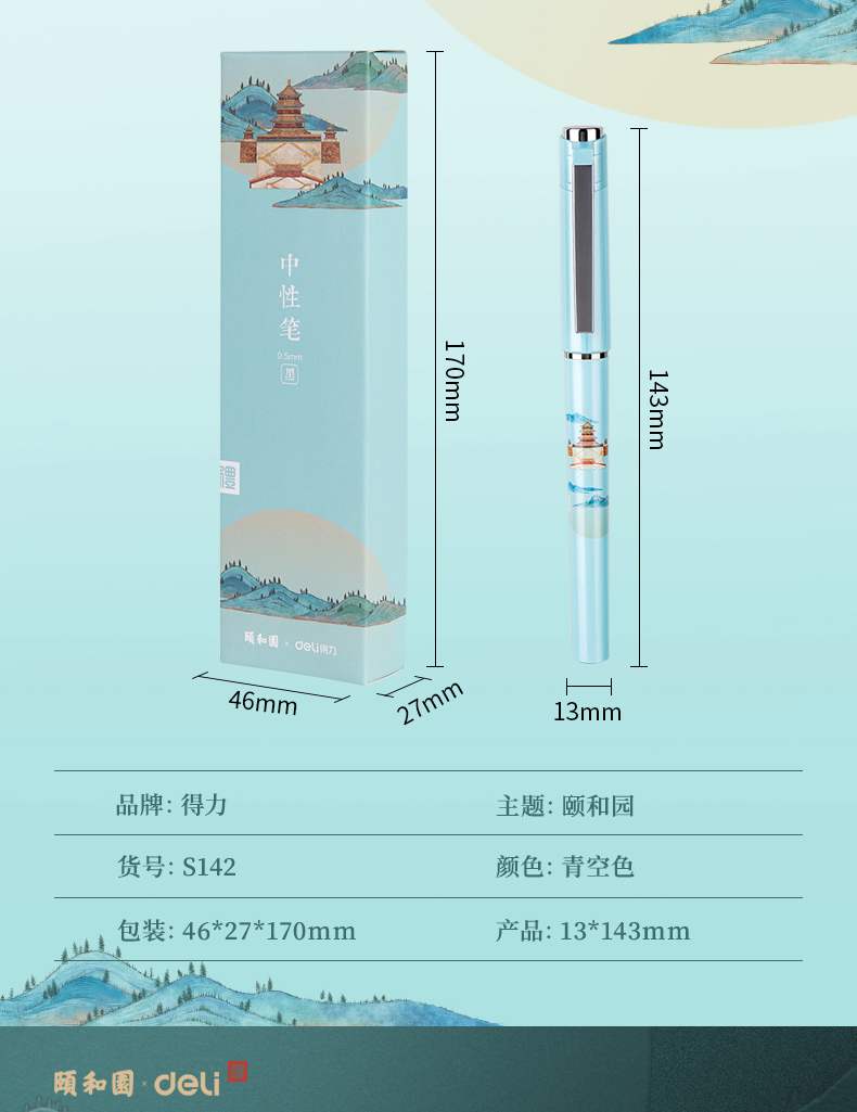 商品名称:得力S142,0.5mm颐和园中性笔(1/24/288)子弹头中国宫廷风签字笔碳素笔 商品编号:11.03.01.0142 品牌:得力/deli 上架时间:2018-12-01 商品毛重:0克 价格单位:支 笔头类型:子弹头 笔头粗细:0.5mm 包装含量:1/24/288 如果您发现商品信息不准确,欢迎纠错;如果您发现有比51文具价格更低的,欢迎举报