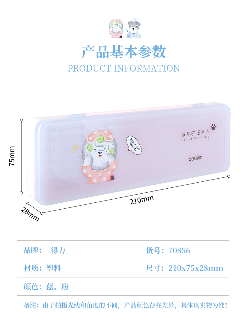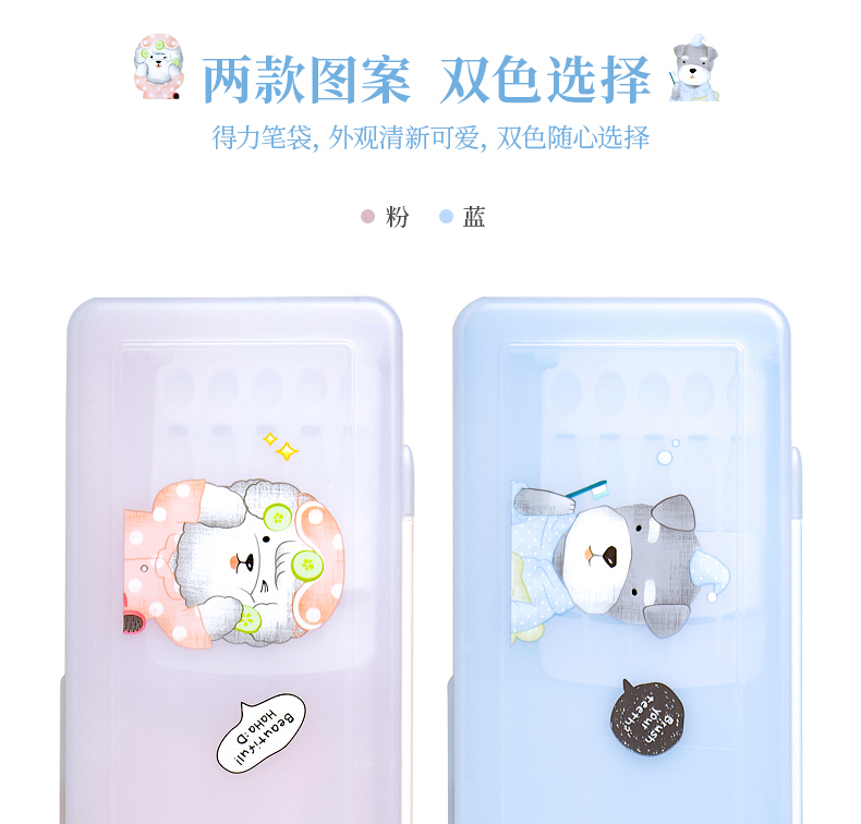 商品名称:得力70856,带笔插设计汪星人文具盒(1/12/144)学生儿童多功能铅笔盒小巧便携耐用塑料文具盒 商品编号:11.12.01.70856 品牌:得力/deli 上架时间:2018-12-04 商品毛重:0克 如果您发现商品信息不准确,欢迎纠错;如果您发现有比51文具价格更低的,欢迎举报