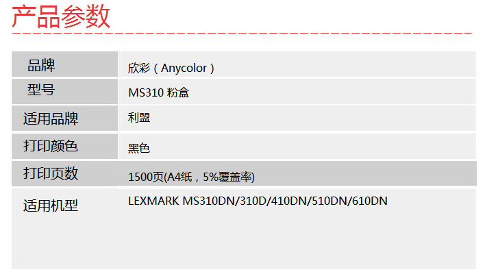 商品名称:欣彩MS310T,黑色粉盒(1/10)适用于利盟/Lexmark 50F3X0E MS410DN/MS415DN/MS510DN/MS610DE 商品编号:62.01.10.0310 品牌:欣彩/Anycolor 上架时间:2019-02-18 商品毛重:0克 如果您发现商品信息不准确,欢迎纠错;如果您发现有比51文具价格更低的,欢迎举报