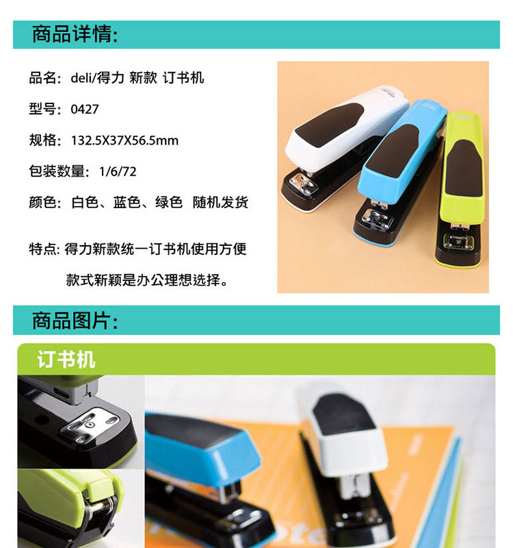 商品名称:得力0427,订书机(混合) 商品编号:12.02.01.0150 品牌:文具/LZN 上架时间:2014-09-23 商品毛重:0克 类型:订书机 含量:1/6/72 起订量:个 如果您发现商品信息不准确,欢迎纠错;如果您发现有比51文具价格更低的,欢迎举报 办公用品,得力订书机,订书机,重型订书机,迷你订书机,卡通订书器,订书器,办公专用订书机,厚层订书机,省力订书机,平钉订书机,12号订书机,10订书机