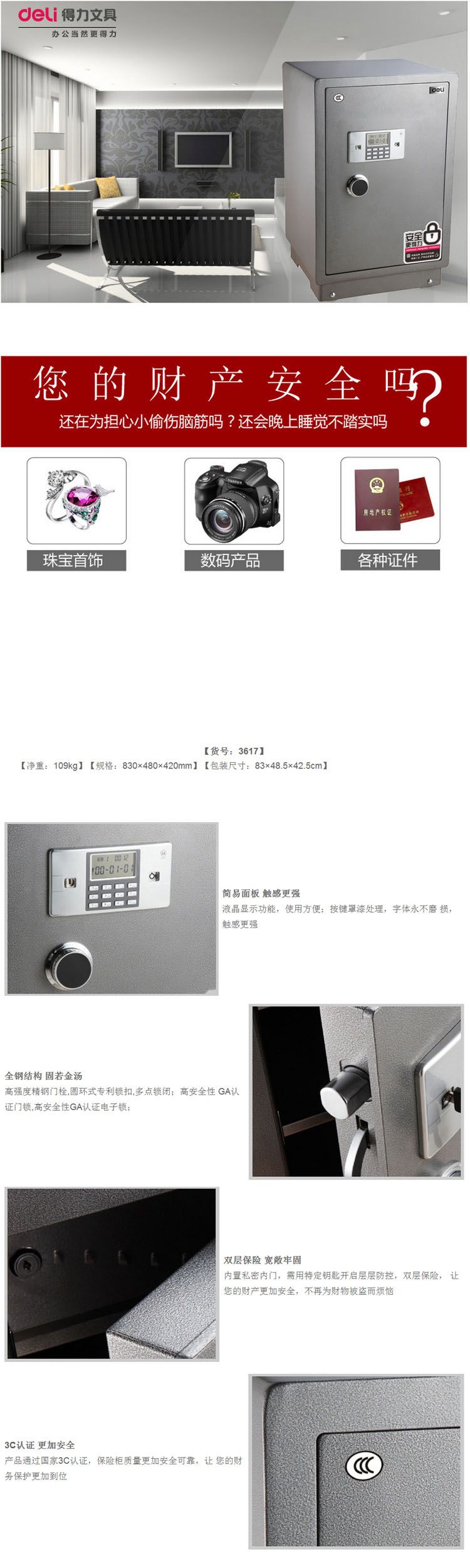 商品名称:得力3617,83CM,3C电子保险箱H83*W48*D42 商品编号:12.07.72.0117 品牌:文具/LZN 上架时间:2014-09-23 商品毛重:0克 含量:1/1 起订量:台 如果您发现商品信息不准确,欢迎纠错;如果您发现有比51文具价格更低的,欢迎举报