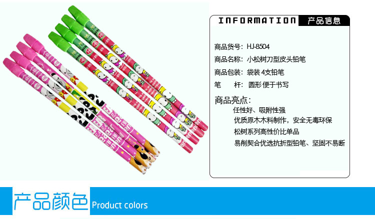 商品名称:小松树8504,袋装子弹头铅笔-HJ8504 商品编号:04.01.01.8504 品牌:小松鼠/squirrel 上架时间:2015-06-16 商品毛重:0克 笔杆材质:椴木杆 铅芯规格:2.2mm 类型:HB 是否带橡皮头:带 包装方式:4/144/2880 如果您发现商品信息不准确,欢迎纠错;如果您发现有比51文具价格更低的,欢迎举报