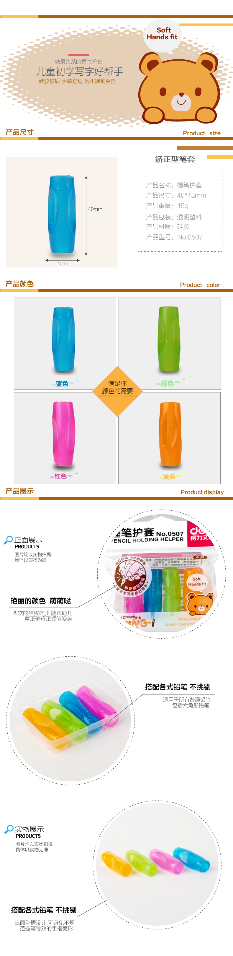 商品名称:得力0507,优酷 握笔护套,握笔器 商品编号:12.02.04.1141 品牌:得力/deli 上架时间:2015-10-26 商品毛重:0克 规格:4只装 含量:1/24/720 如果您发现商品信息不准确,欢迎纠错;如果您发现有比51文具价格更低的,欢迎举报