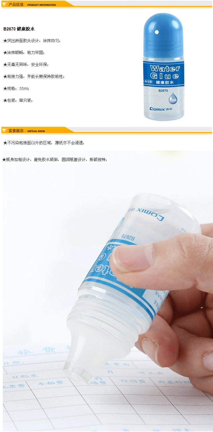 商品名称:齐心B2670,液体胶水(35ml) 商品编号:13.02.04.0110 品牌:齐心/COMIX 上架时间:2014-07-14 商品毛重:0克 规格:35ml 含量:1/12/288 起订量:盒 如果您发现商品信息不准确,欢迎纠错;如果您发现有比51文具价格更低的,欢迎举报