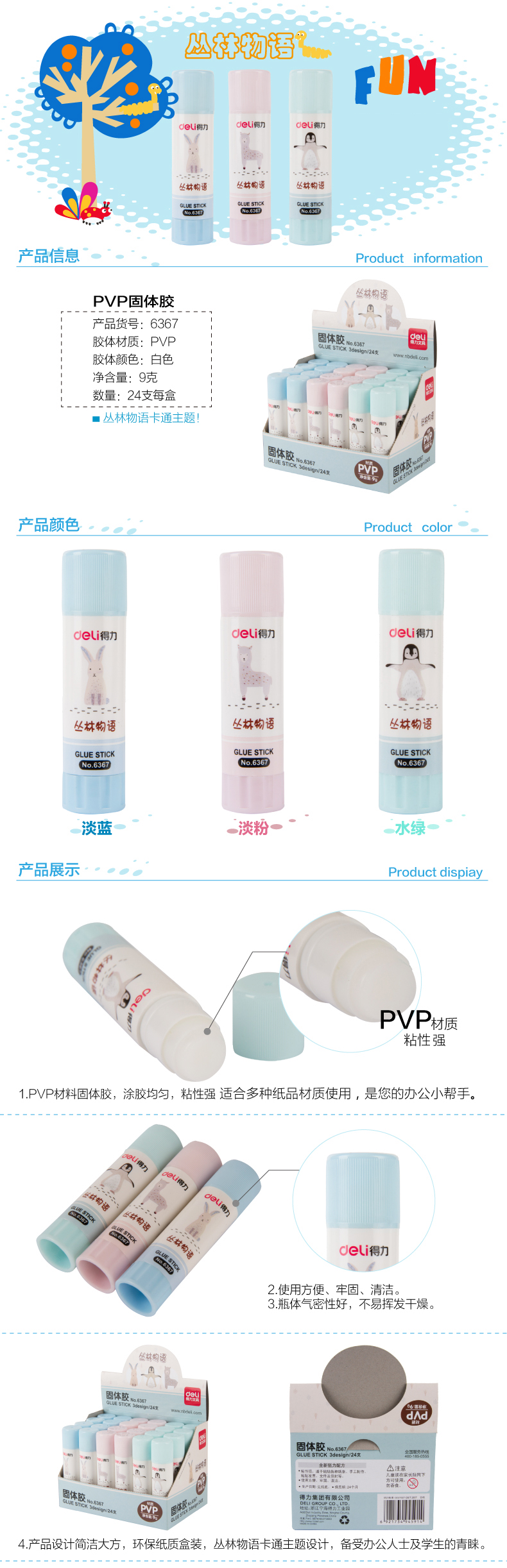 商品名称:得力6367,9g卡通PVP固体胶 商品编号:12.02.17.0128 品牌:文具/LZN 上架时间:2015-12-12 商品毛重:0克 含量:1/24/864 如果您发现商品信息不准确,欢迎纠错;如果您发现有比51文具价格更低的,欢迎举报