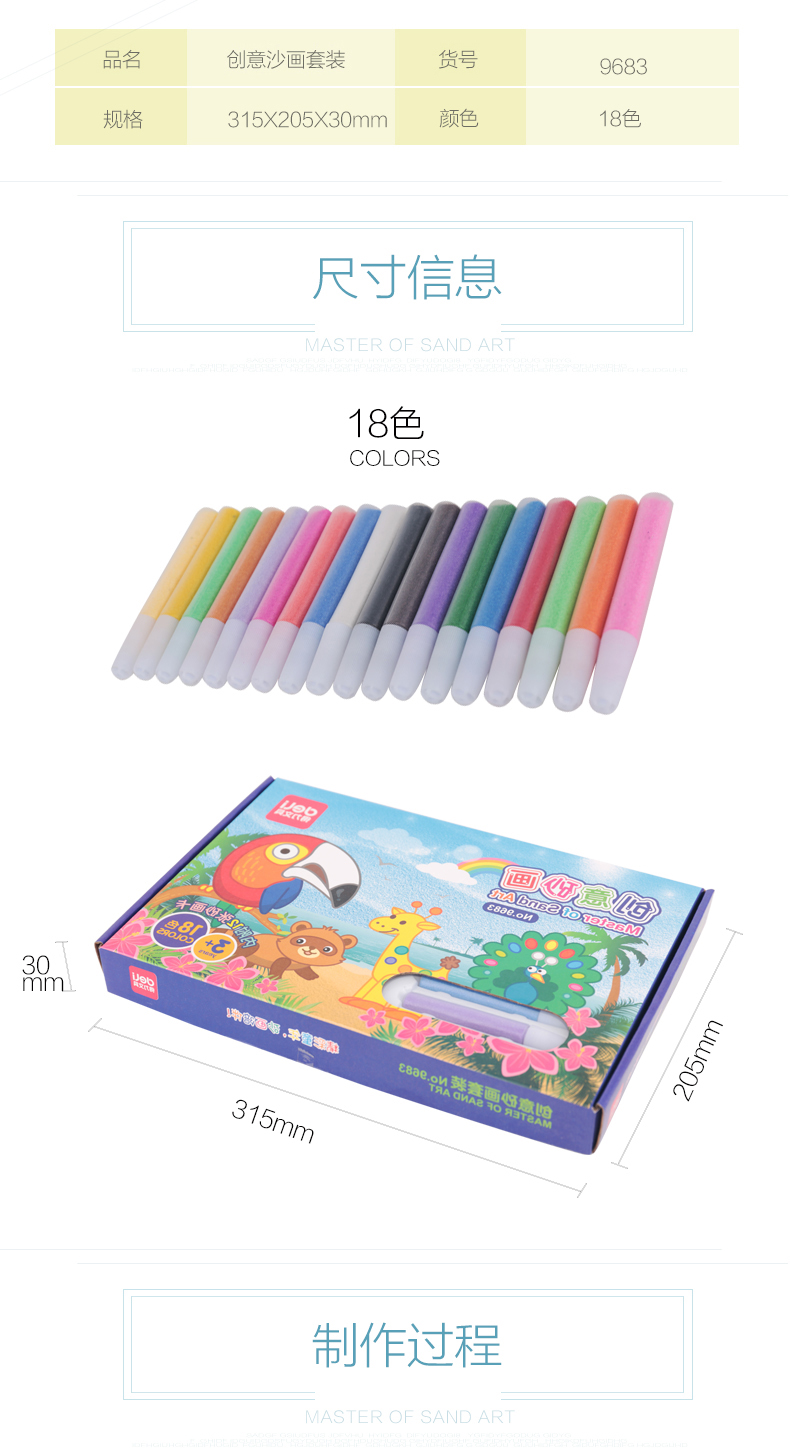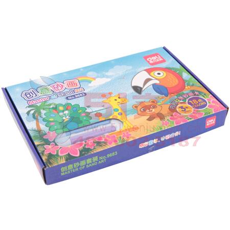 商品名称:得力9683,砂画套装(1/36)18色彩沙+12张沙画 商品编号:11.21.01.9683 品牌:得力/deli 上架时间:2015-12-14 商品毛重:0克 包装含量:1/36 价格单位:盒 起批量:盒 如果您发现商品信息不准确,欢迎纠错;如果您发现有比51文具价格更低的,欢迎举报