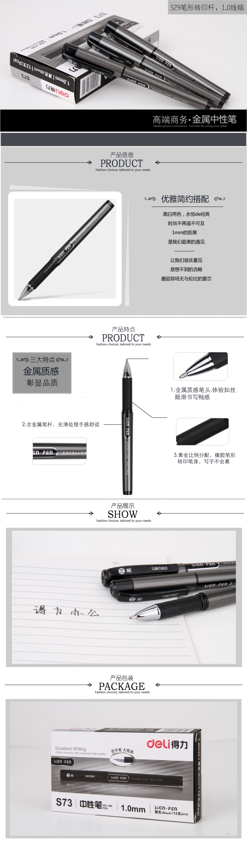 商品名称:得力S73,大笔画签字笔-1.0MM 商品编号:12.03.01.0073 品牌:得力/deli 上架时间:2016-01-12 商品毛重:0克 价格单位:支 笔头类型:子弹头 笔头粗细:1.0mm 包装含量:12/144/1728 如果您发现商品信息不准确,欢迎纠错;如果您发现有比51文具价格更低的,欢迎举报