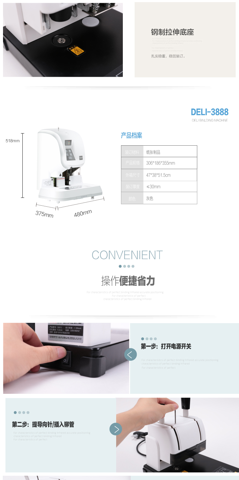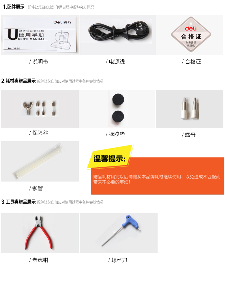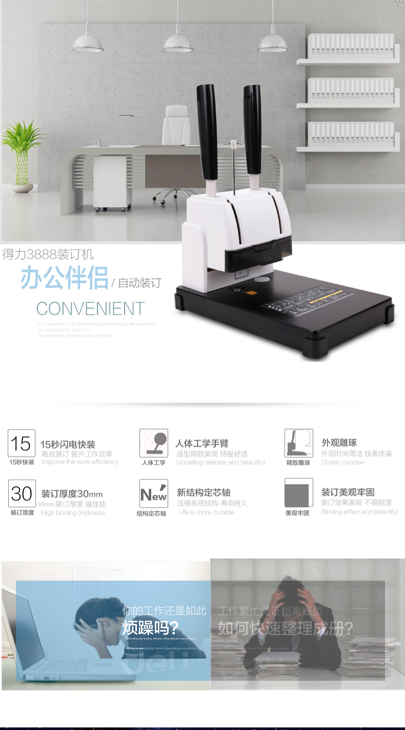商品名称:得力3888,财务凭证装订机,3CM装订厚度,4.8MM装订铆管 商品编号:12.07.66.0188 品牌:文具/LZN 上架时间:2016-01-13 商品毛重:0克 如果您发现商品信息不准确,欢迎纠错;如果您发现有比51文具价格更低的,欢迎举报