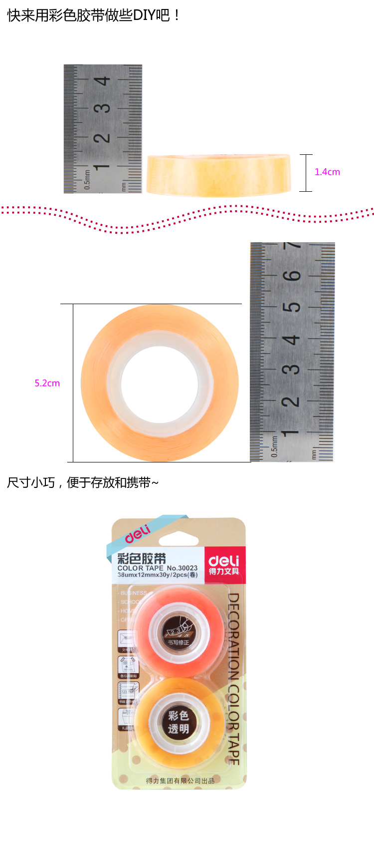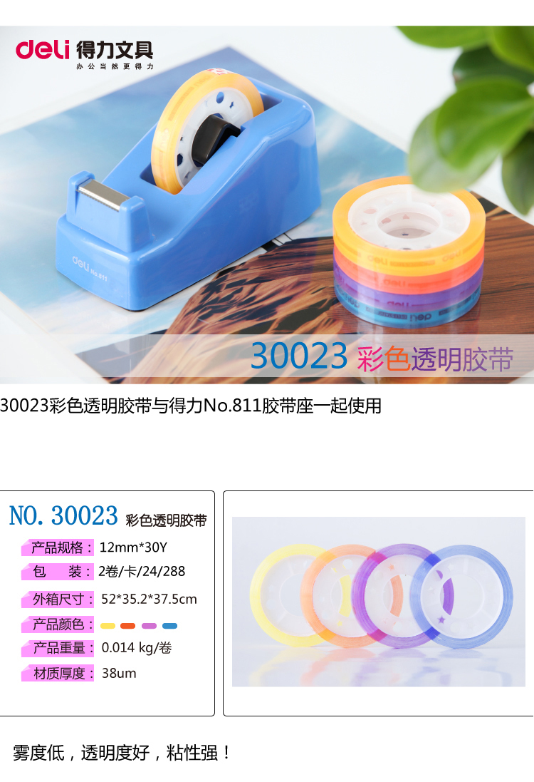 商品名称:得力30023,卡装彩色文具胶带(2卷装)12*30Y(爆款一口价) 商品编号:12.09.01.0123 品牌:文具/LZN 上架时间:2016-01-14 商品毛重:0克 宽度:12mm 长度:30码 包装:1/24/288 起订量:板 如果您发现商品信息不准确,欢迎纠错;如果您发现有比51文具价格更低的,欢迎举报