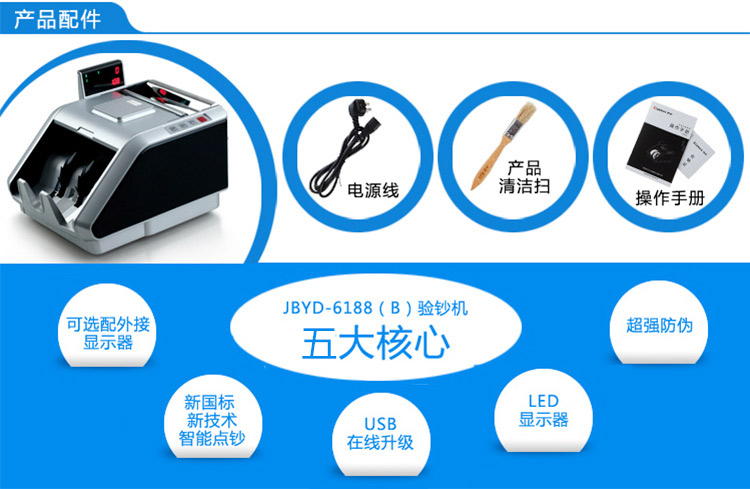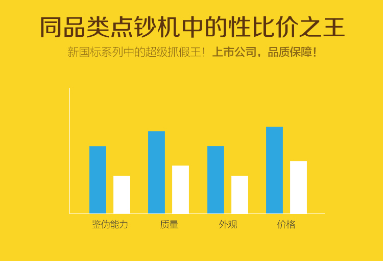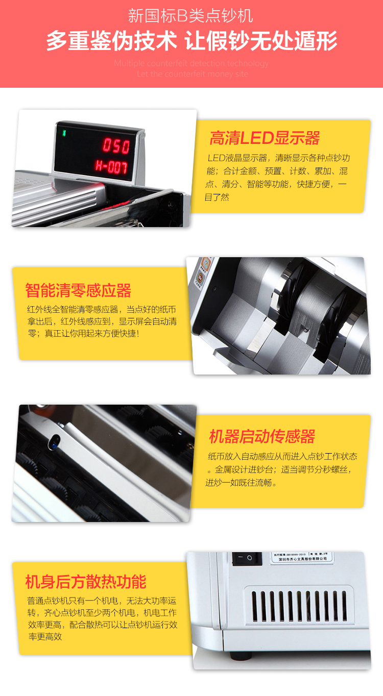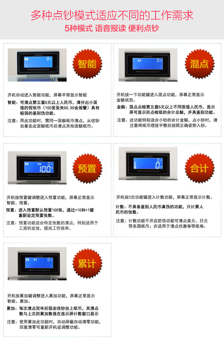 商品属性 [类型] 新国标B类 [磁性鉴伪] 支持 [磁性安全线鉴伪] 支持 [红外鉴伪] 支持 [荧光鉴伪] 支持 [混点点钞] 支持 [智能升级] 支持 [合计金额] 支持 [包装含量] 1/2
