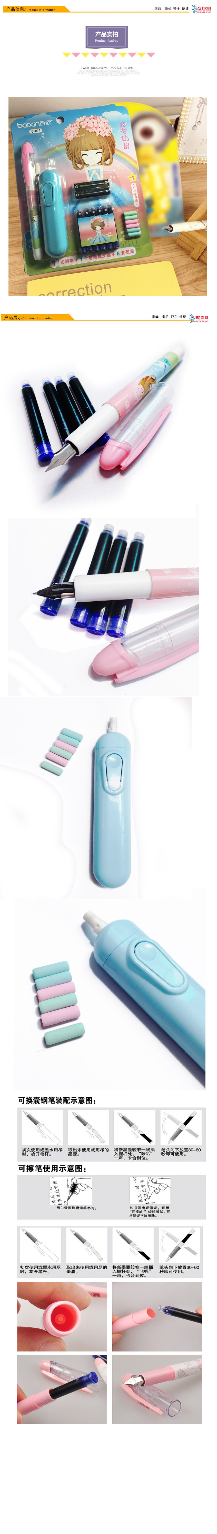 商品名称:百欣6001,墨囊钢笔-1+6电动橡皮组合套装-可擦蓝(1/20/240) 商品编号:09.01.01.6001 品牌:百欣 上架时间:2016-05-05 商品毛重:0克 如果您发现商品信息不准确,欢迎纠错;如果您发现有比51文具价格更低的,欢迎举报