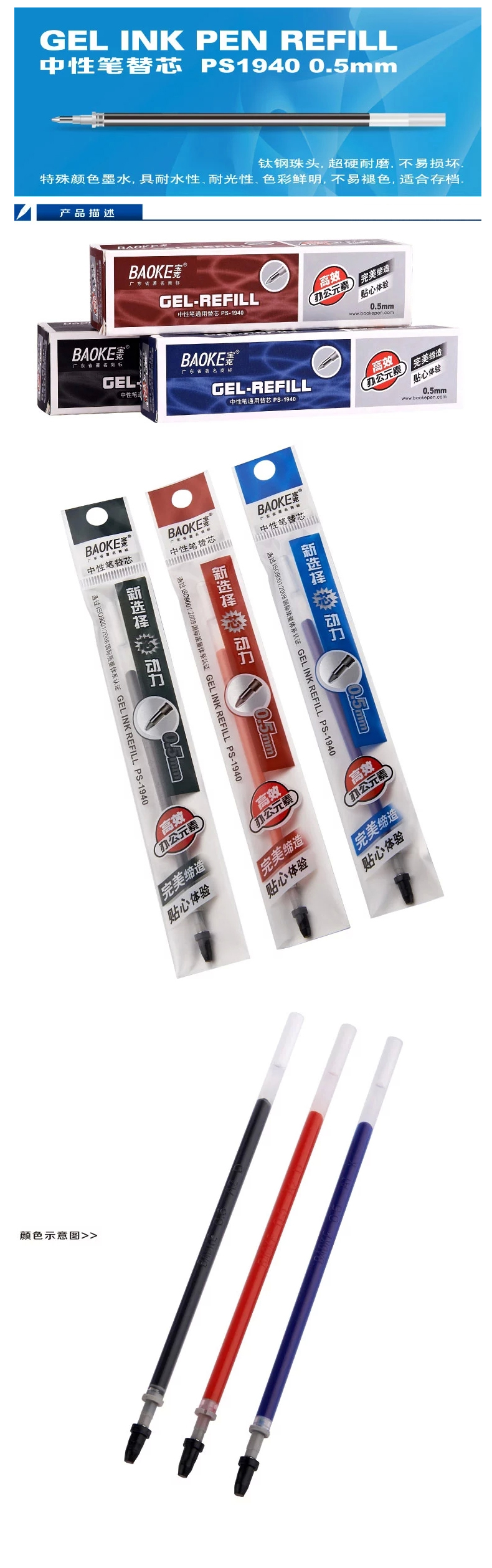 商品名称:宝克1940,0.5mm中性笔芯-黑色 商品编号:14.01.05.1940B 品牌:宝克/BAOKE 上架时间:2016-07-04 商品毛重:0克 价格单位:支 笔头类型:子弹头 笔头粗细:0.5mm 包装含量:20支/盒,200支/条,2400支/件 如果您发现商品信息不准确,欢迎纠错;如果您发现有比51文具价格更低的,欢迎举报