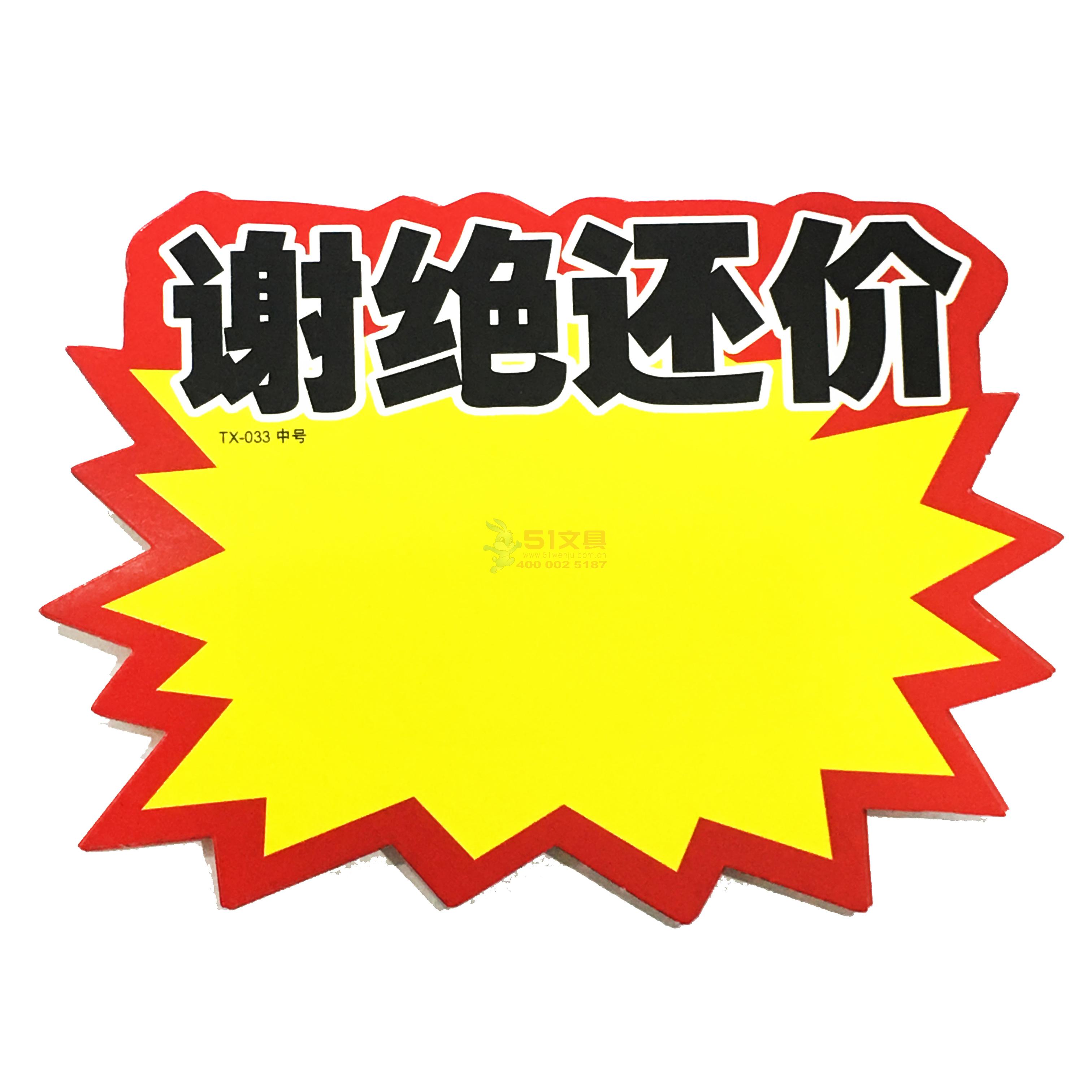 商品名称:TX-033 朝阳 中号谢绝还价爆炸贴(10张) 商品编号:01.04.04.2033 品牌:朝阳 上架时间:2016-07-06 商品毛重:0克 如果您发现商品信息不准确,欢迎纠错;如果您发现有比51文具价格更低的,欢迎举报