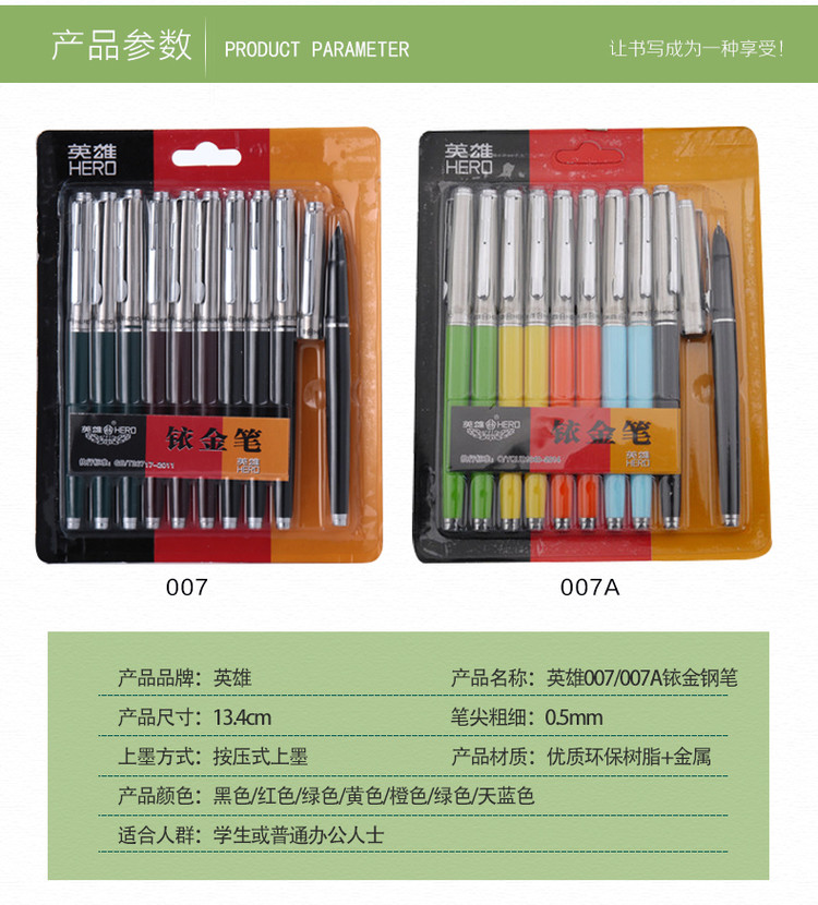 商品名称:007A 英雄 钢笔 商品编号:91.04.03.0007A 品牌:英雄/HERO 上架时间:2016-08-20 商品毛重:0克 如果您发现商品信息不准确,欢迎纠错;如果您发现有比51文具价格更低的,欢迎举报