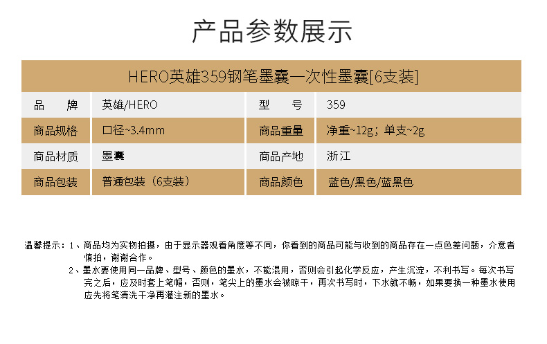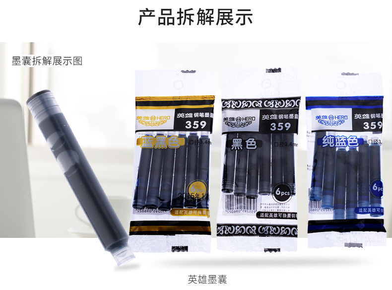 商品名称:359 英雄 钢笔墨囊(6支装) 商品编号:91.04.03.0359N 品牌:英雄/HERO 上架时间:2016-08-22 商品毛重:0克 包装规格:1/12/144 如果您发现商品信息不准确,欢迎纠错;如果您发现有比51文具价格更低的,欢迎举报