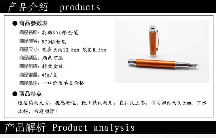 商品名称:970 英雄 高级铱金笔 商品编号:91.04.03.0970 品牌:英雄/HERO 上架时间:2016-08-22 商品毛重:0克 如果您发现商品信息不准确,欢迎纠错;如果您发现有比51文具价格更低的,欢迎举报