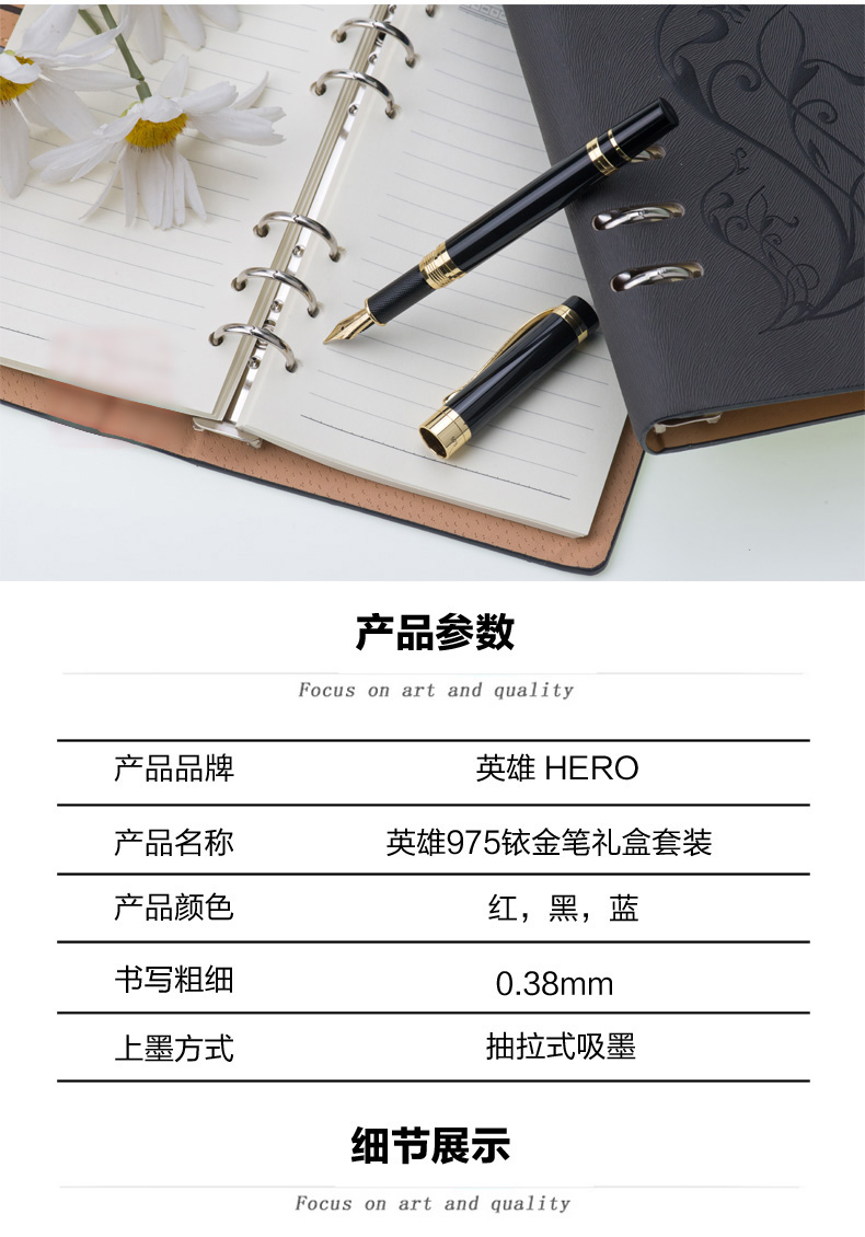 商品名称:975 英雄 高级铱金钢笔 商品编号:91.04.03.0975 品牌:英雄/HERO 上架时间:2016-08-22 商品毛重:0克 如果您发现商品信息不准确,欢迎纠错;如果您发现有比51文具价格更低的,欢迎举报
