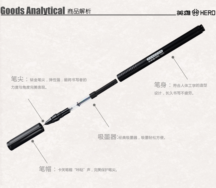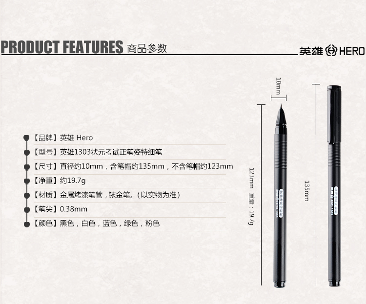 商品名称:1303 英雄 钢笔 商品编号:91.04.03.1303 品牌:英雄/HERO 上架时间:2016-08-22 商品毛重:0克 如果您发现商品信息不准确,欢迎纠错;如果您发现有比51文具价格更低的,欢迎举报
