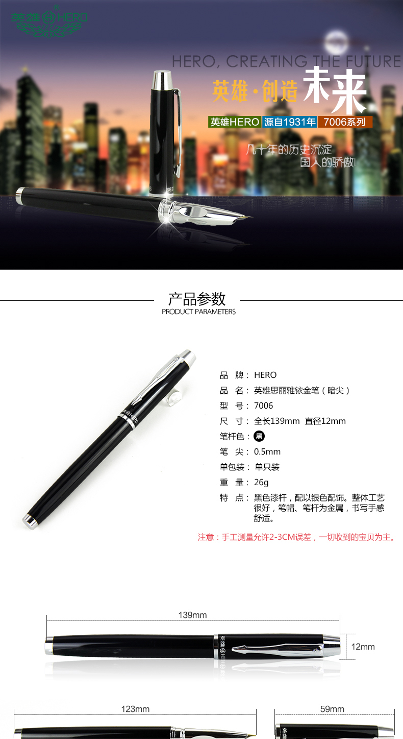 商品名称:7006 英雄 钢笔 商品编号:91.04.03.7006 品牌:英雄/HERO 上架时间:2016-08-22 商品毛重:0克 如果您发现商品信息不准确,欢迎纠错;如果您发现有比51文具价格更低的,欢迎举报