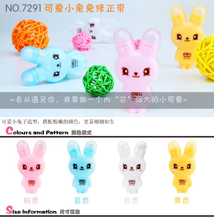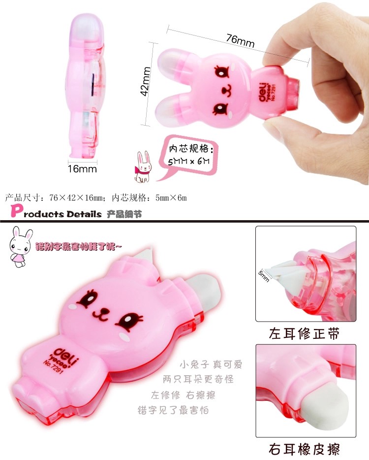 商品名称:得力7291,修正带橡皮擦两用可爱卡通咪兔-6米 商品编号:11.13.03.7291 品牌:得力/deli 上架时间:2016-10-11 商品毛重:0克 规格:76*42mm 含量:1/24/288 如果您发现商品信息不准确,欢迎纠错;如果您发现有比51文具价格更低的,欢迎举报