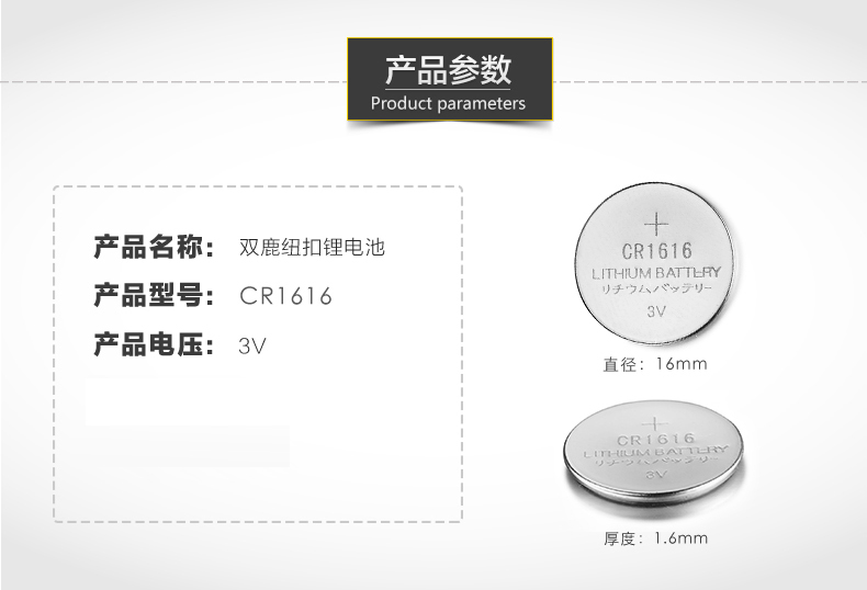 商品名称:CR1616 双鹿 3V锂电池-5B撕卡装 商品编号:56.02.1616 品牌:双鹿/SONLU 上架时间:2016-12-22 商品毛重:0克 价格单位:粒 如果您发现商品信息不准确,欢迎纠错;如果您发现有比51文具价格更低的,欢迎举报