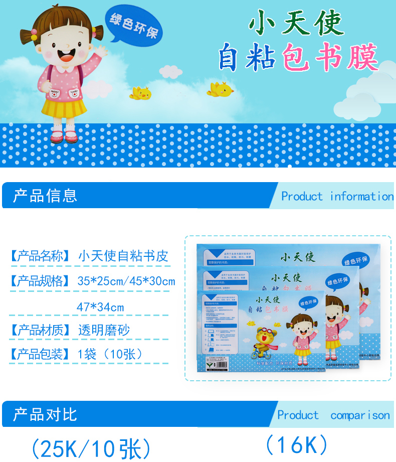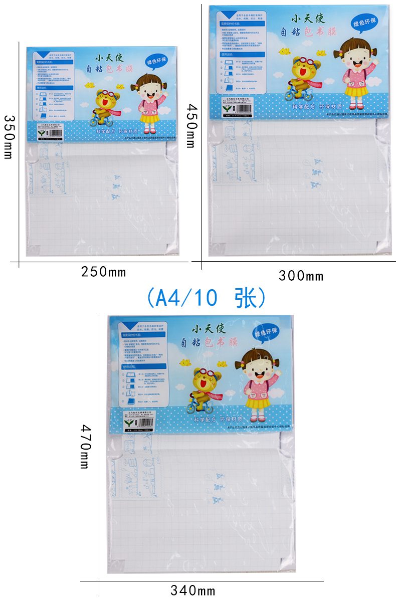 商品名称:小天使 A4自粘书皮,特大号包书皮,平面自粘包书皮/包书膜-10张装 商品编号:17.11.03.0203 品牌:小天使/CHERUB 上架时间:2016-12-25 商品毛重:0克 如果您发现商品信息不准确,欢迎纠错;如果您发现有比51文具价格更低的,欢迎举报