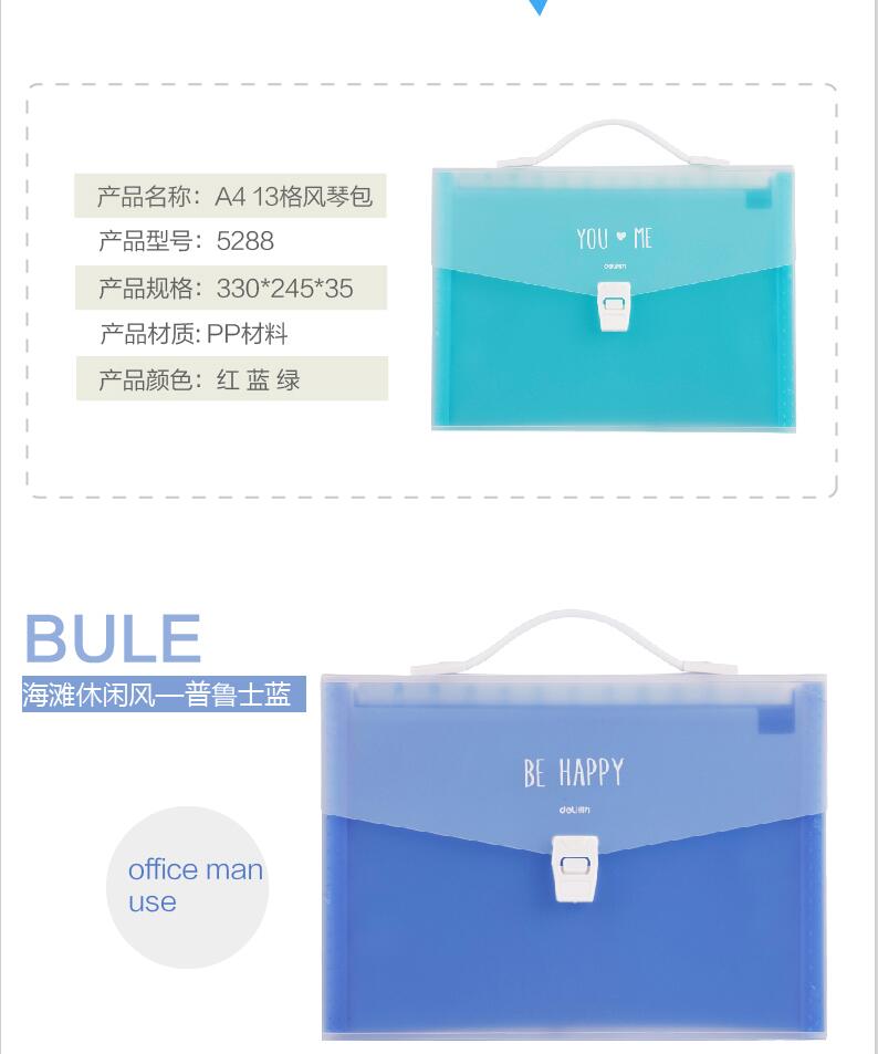 商品名称:得力5288,A4,13格学生风琴包(1/12/48)得力风琴包 商品编号:11.02.05.5288 品牌:得力/deli 上架时间:2017-02-16 商品毛重:0克 如果您发现商品信息不准确,欢迎纠错;如果您发现有比51文具价格更低的,欢迎举报