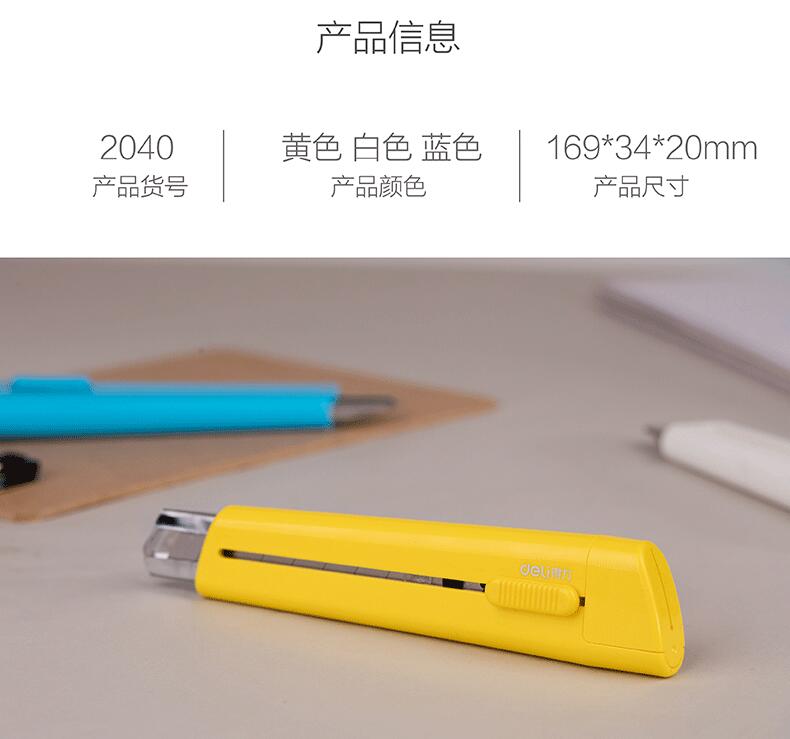 商品名称:得力2040,大号多彩美工刀(1/12/144)带保护套大号美工刀 18mm裁纸刀 壁纸刀小刀 商品编号:12.02.15.2040 品牌:文具/LZN 上架时间:2017-02-16 商品毛重:0克 如果您发现商品信息不准确,欢迎纠错;如果您发现有比51文具价格更低的,欢迎举报