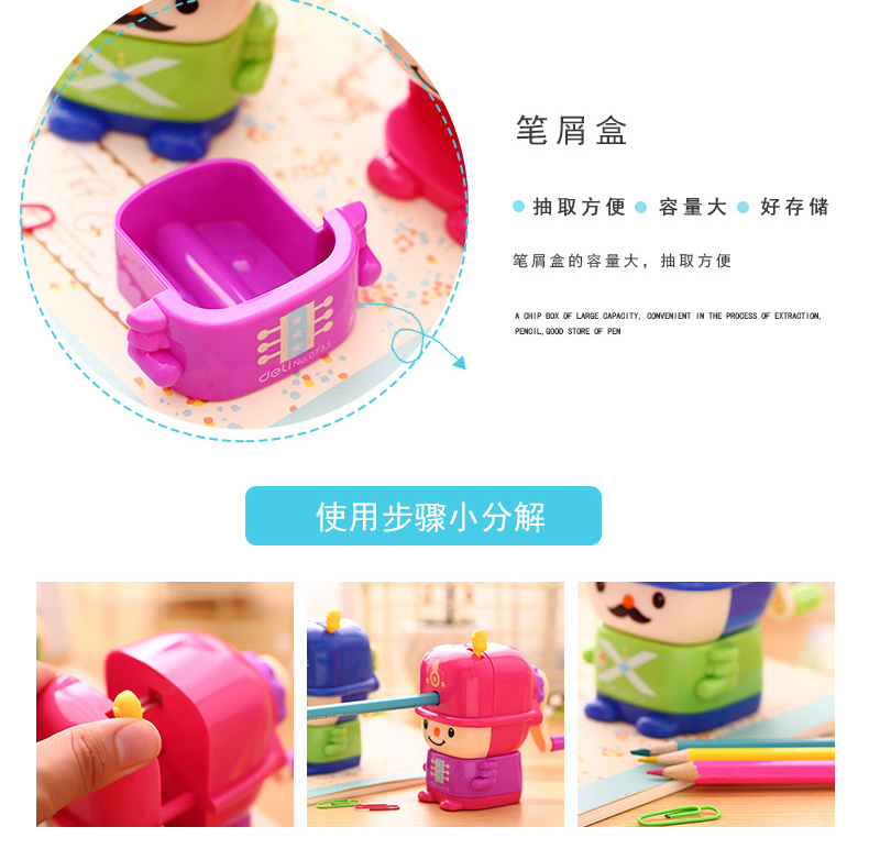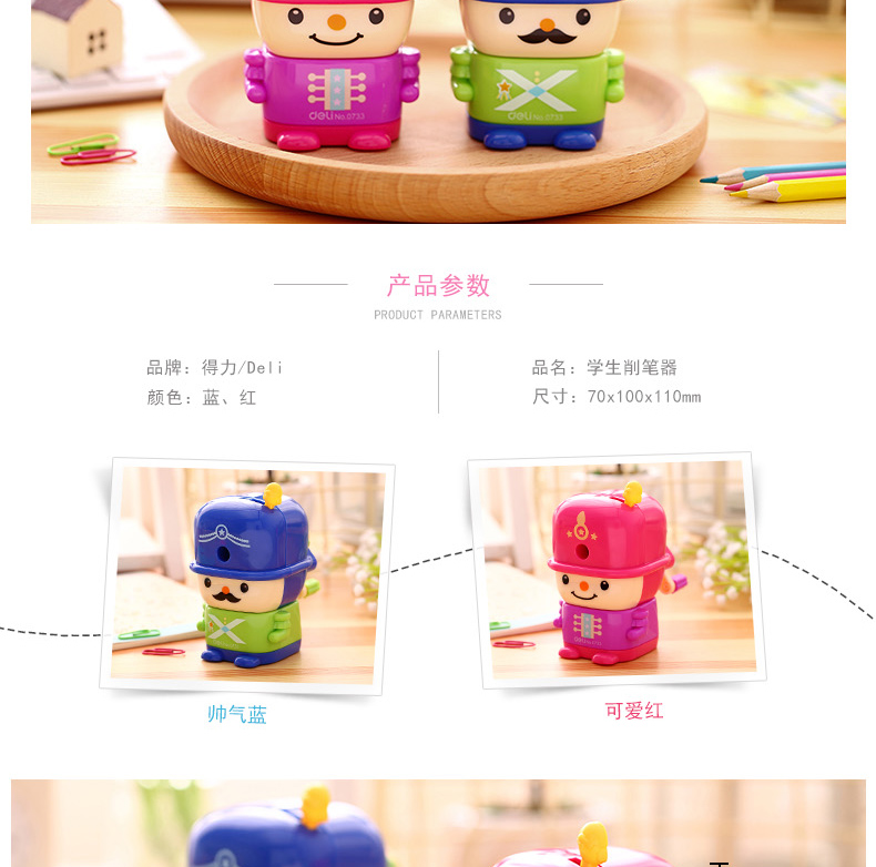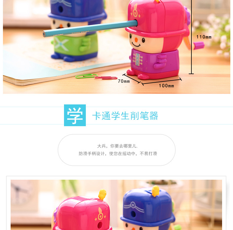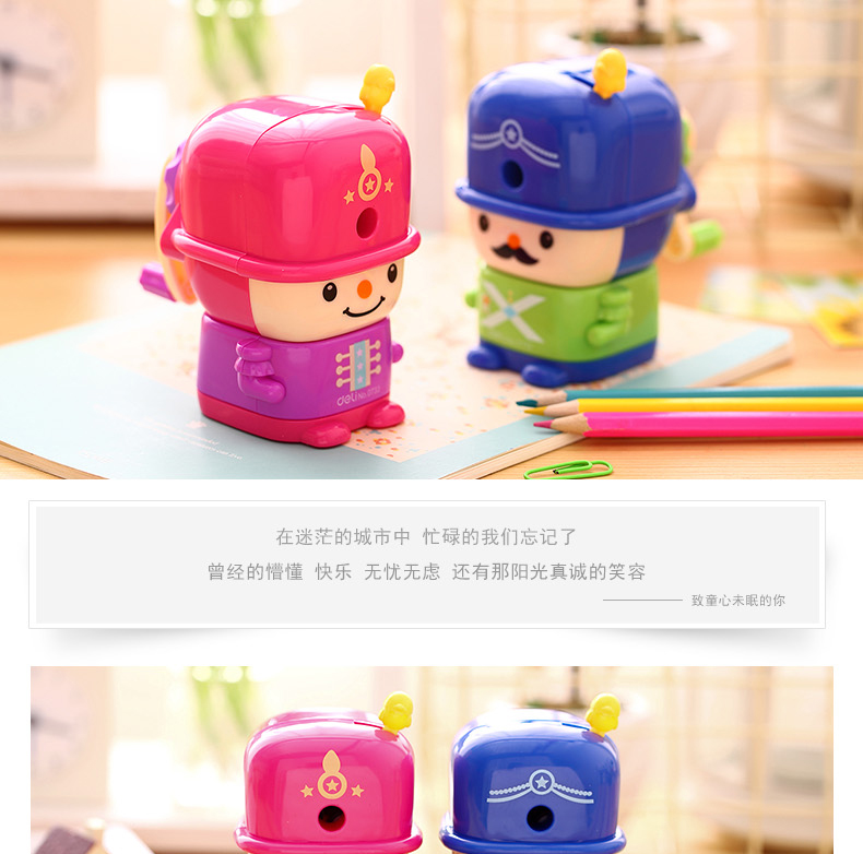 商品名称:得力0733,削笔机学生手摇铅笔刀削笔器可爱儿童大兵卷笔刀 商品编号:12.11.25.0733 品牌:得力/deli 上架时间:2017-04-24 商品毛重:0克 如果您发现商品信息不准确,欢迎纠错;如果您发现有比51文具价格更低的,欢迎举报
