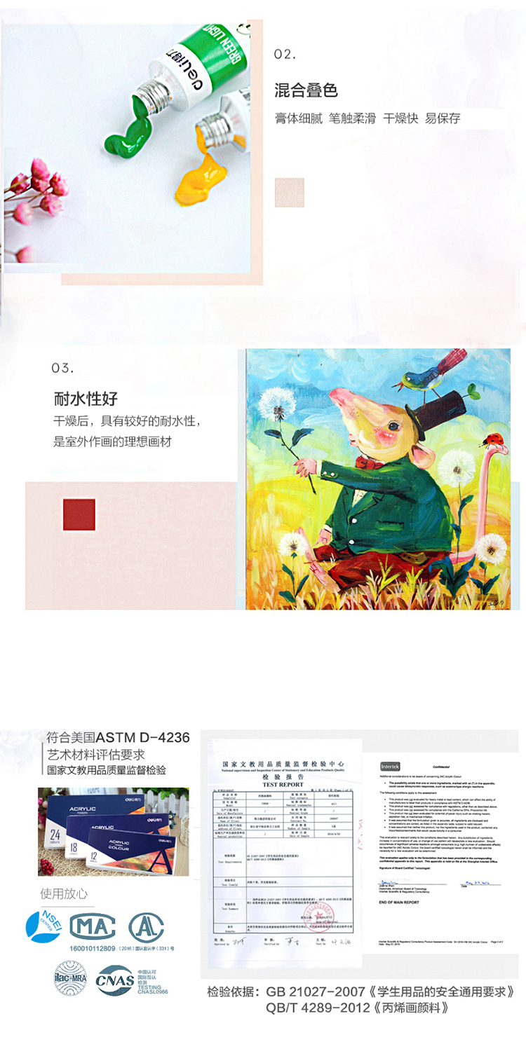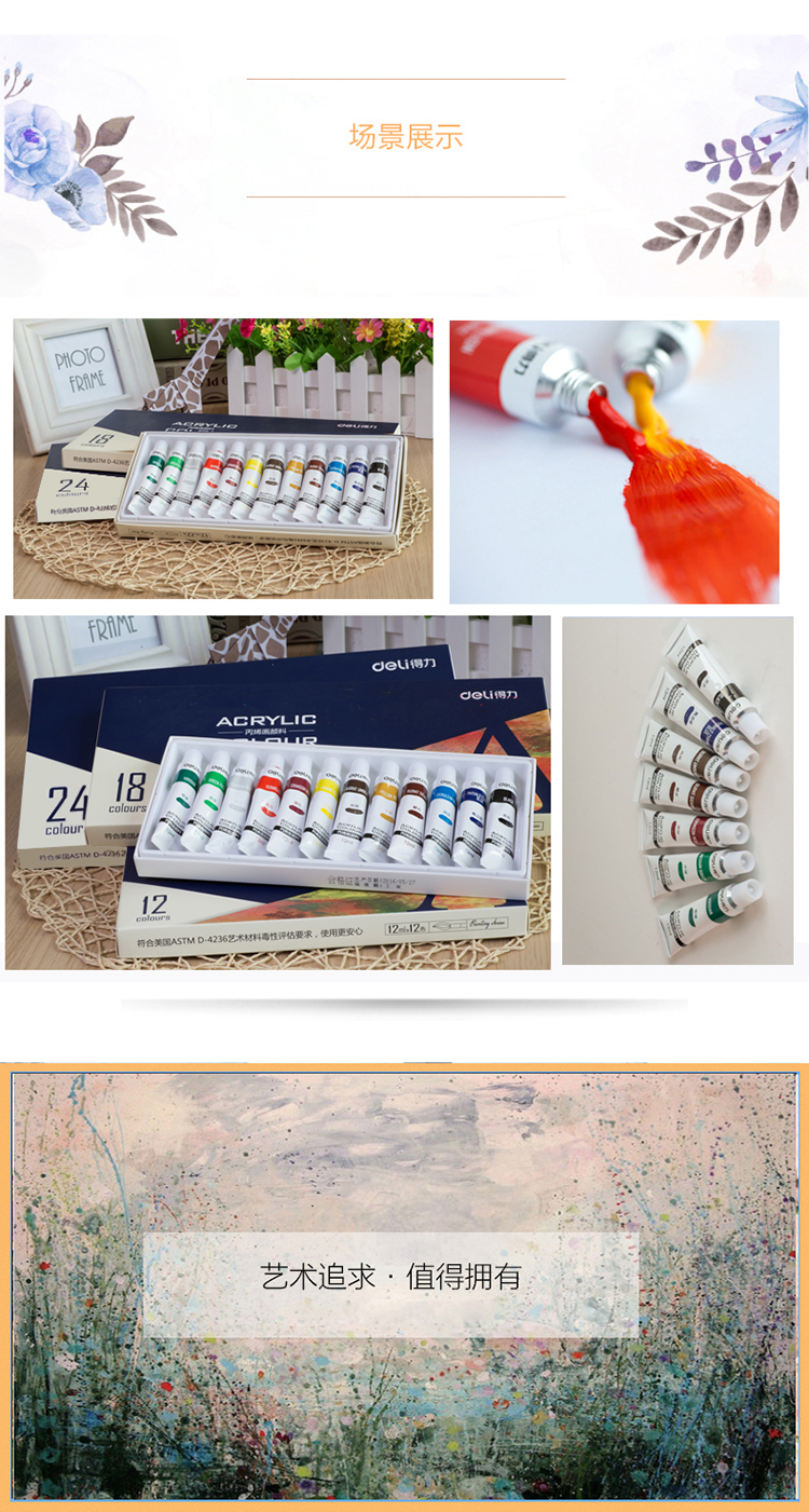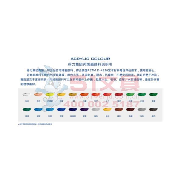 商品名称:得力73858,美术绘24色画丙烯颜料 盒装 商品编号:12.11.44.73858 品牌:得力/deli 上架时间:2017-05-16 商品毛重:0克 颜色数:24色 包装含量:1/6/24 价格单位:盒 起批量:盒 如果您发现商品信息不准确,欢迎纠错;如果您发现有比51文具价格更低的,欢迎举报