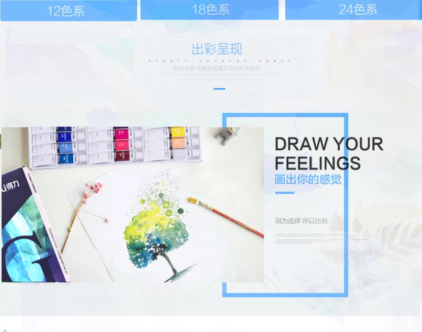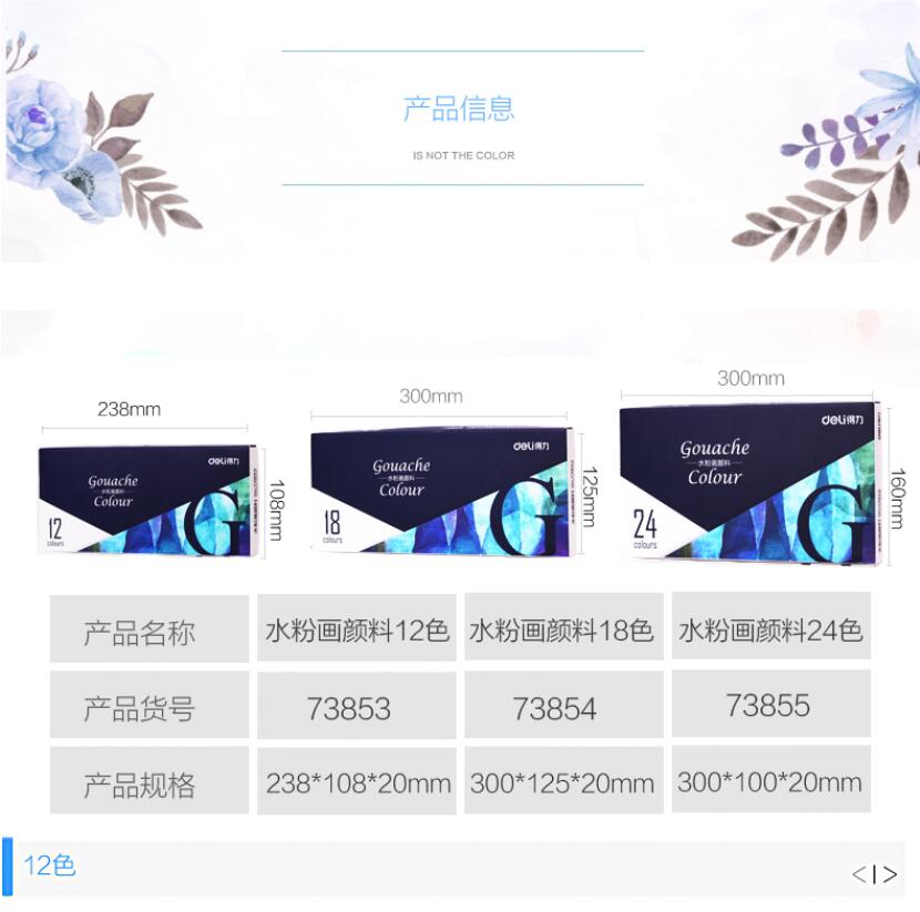 商品名称:得力73853,美术绘画12色水粉颜料 盒装 商品编号:12.11.44.73853 品牌:得力/deli 上架时间:2017-05-16 商品毛重:0克 颜色数:12色 价格单位:盒 起批量:盒 包装含量:1/12/72 如果您发现商品信息不准确,欢迎纠错;如果您发现有比51文具价格更低的,欢迎举报