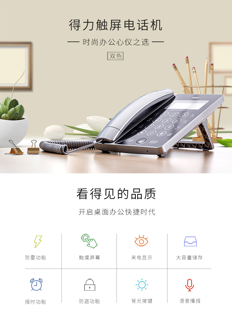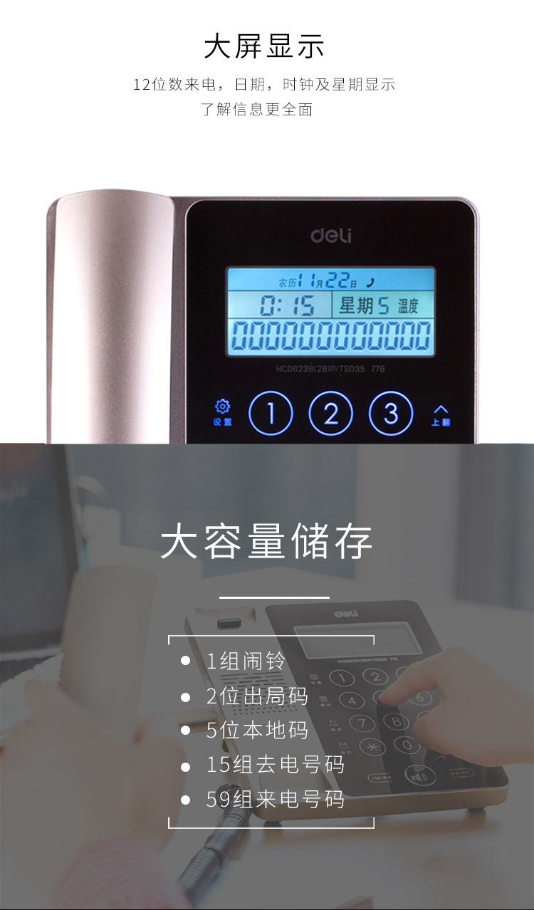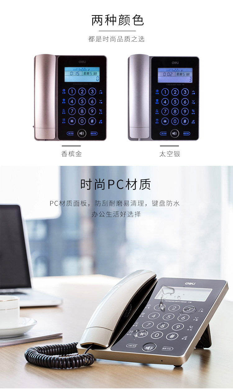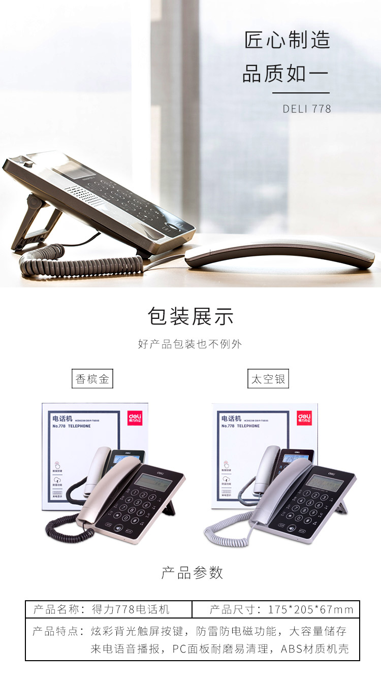 商品名称:得力778,触屏电话机办公家用炫彩夜光电话机防水面板来电报号座机-香槟金 商品编号:12.07.64.0778 品牌:文具/LZN 上架时间:2017-05-17 商品毛重:0克 如果您发现商品信息不准确,欢迎纠错;如果您发现有比51文具价格更低的,欢迎举报
