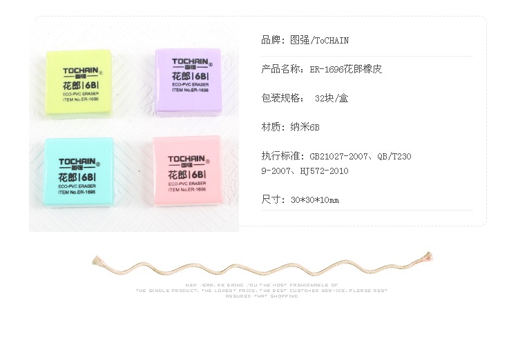 商品名称:ER-1696 图强 6B花郎橡皮擦/6B绘图橡皮/环保PVC橡皮 商品编号:34.01.01.1696 品牌:图强/TuQiang 上架时间:2017-05-18 商品毛重:0克 如果您发现商品信息不准确,欢迎纠错;如果您发现有比51文具价格更低的,欢迎举报