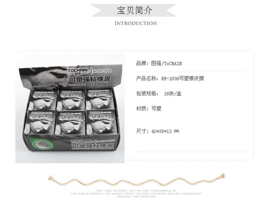 商品名称:ER-1639 图强 大块可塑橡皮擦,强粘橡皮/素描专用橡皮 商品编号:44.01.01.1639 品牌:图强/TuQiang 上架时间:2017-06-08 商品毛重:0克 如果您发现商品信息不准确,欢迎纠错;如果您发现有比51文具价格更低的,欢迎举报