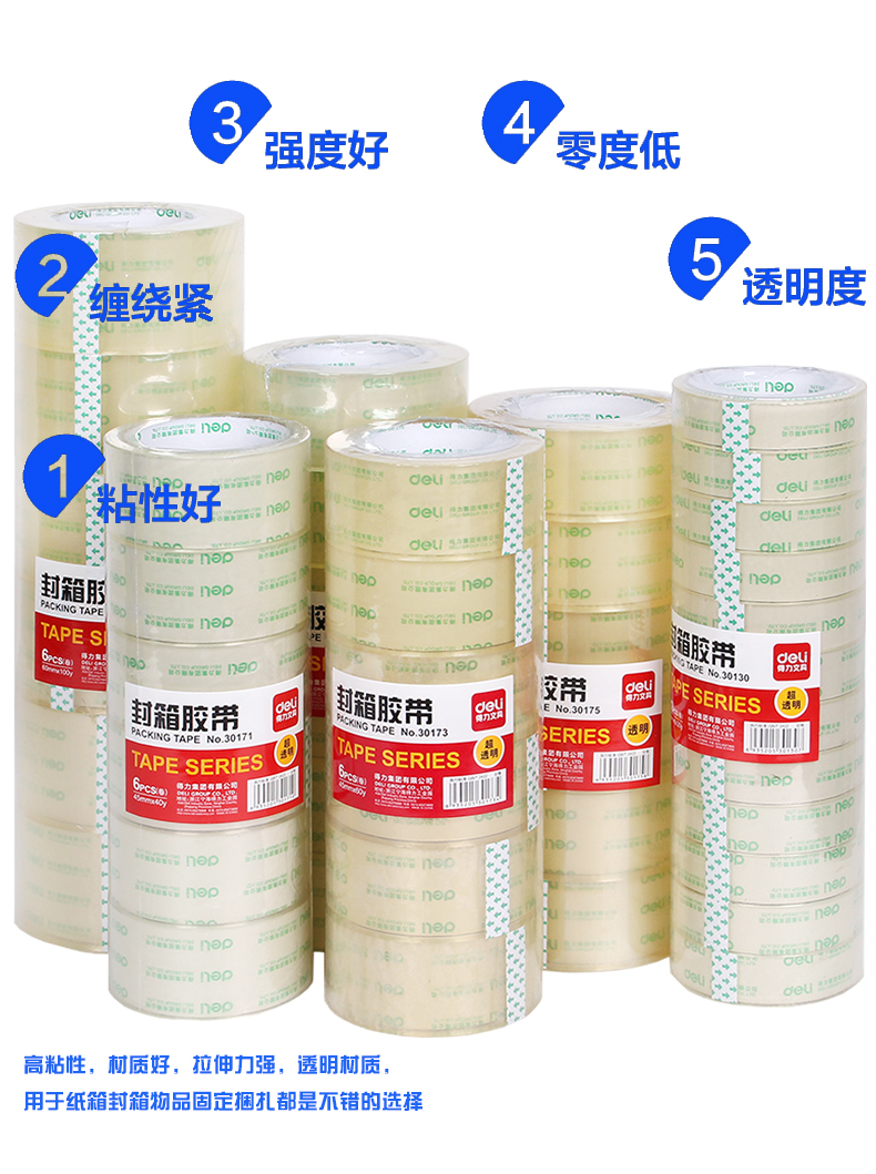 商品名称:得力30171,封箱胶带45*50Y(爆款一口价),宽胶带45*50 商品编号:12.09.01.0171 品牌:文具/LZN 上架时间:2014-09-23 商品毛重:0克 宽度:45mm 长度:50码 包装:1/6/120 起订量:筒 如果您发现商品信息不准确,欢迎纠错;如果您发现有比51文具价格更低的,欢迎举报