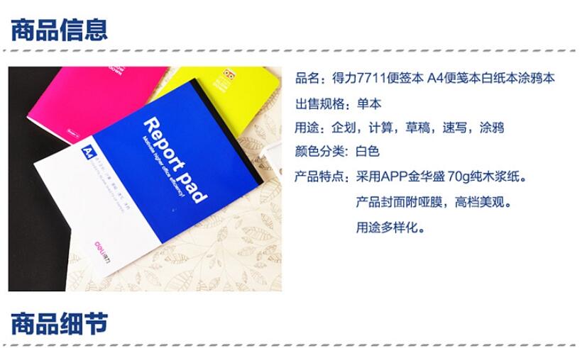 商品名称:得力7711, A4,70张便条本(195*280mm),便笺本/便签本 商品编号:12.05.48.7711 品牌:文具/LZN 上架时间:2017-06-30 商品毛重:0克 规格:195*279mm 含量:1/5/80 起订量:包 如果您发现商品信息不准确,欢迎纠错;如果您发现有比51文具价格更低的,欢迎举报