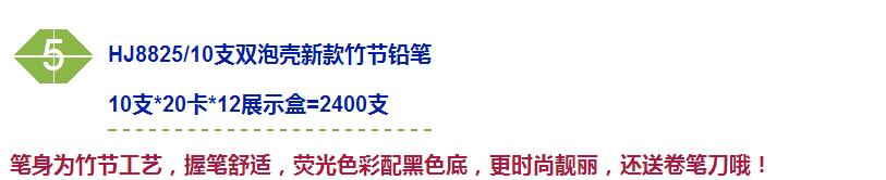 商品名称:小松树8825,双泡壳竹节铅笔(送卷笔刀),HB铅笔-HJ8825 商品编号:04.01.01.8825 品牌:小松鼠/squirrel 上架时间:2017-07-28 商品毛重:0克 笔杆材质:椴木杆 铅芯规格:2.2mm 类型:HB 是否带橡皮头:带 包装方式:10/200/240 如果您发现商品信息不准确,欢迎纠错;如果您发现有比51文具价格更低的,欢迎举报
