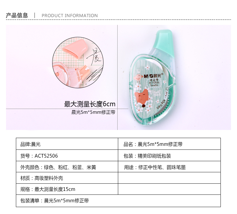 商品名称:晨光ACT52506,小狐西里学生修正带/创意型/涂改带/改错带 商品编号:61.02.11.52506 品牌:晨光/M&G 上架时间:2017-08-06 商品毛重:0克 如果您发现商品信息不准确,欢迎纠错;如果您发现有比51文具价格更低的,欢迎举报