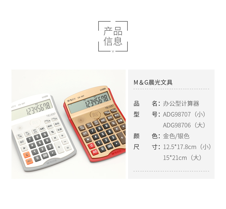 商品名称:晨光ADG98706,标朗财神语音型招财计算器/真人发音计算器-大金/大银 商品编号:61.02.02.98706 品牌:晨光/M&G 上架时间:2017-08-07 商品毛重:0克 如果您发现商品信息不准确,欢迎纠错;如果您发现有比51文具价格更低的,欢迎举报